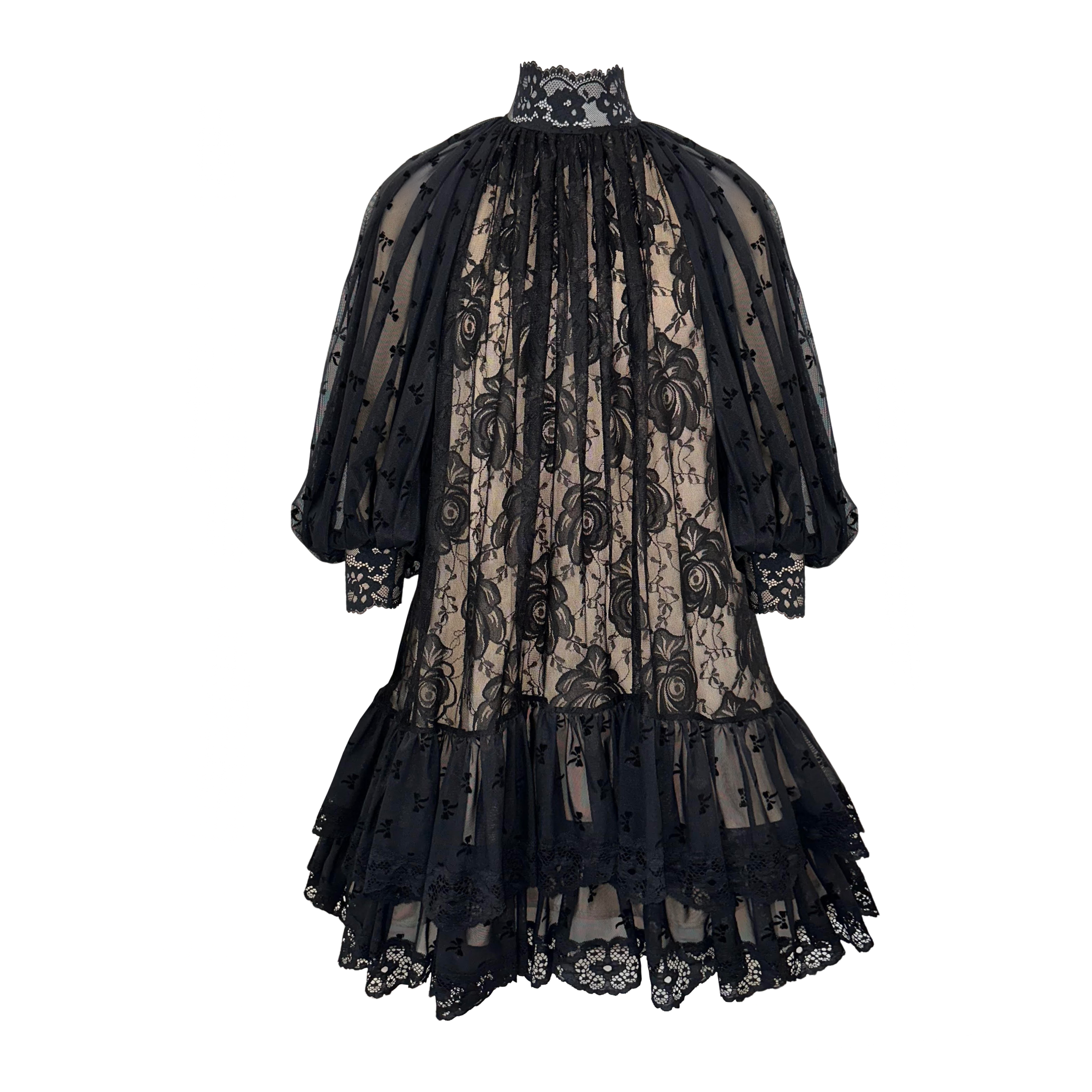 The Candy Dress is a stunning black lace dress that exudes timeless elegance and feminine charm. This exquisite piece features voluminous, long balloon sleeves made from sheer black tulle, adding a dramatic yet refined touch to the silhouette. The dress is adorned with two rows of lace/tulle ruffles, each finished with delicate black lace trims, creating a luxurious and textured look.