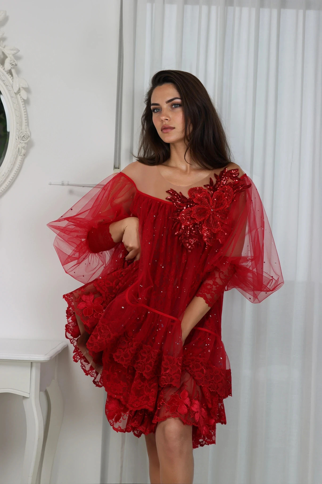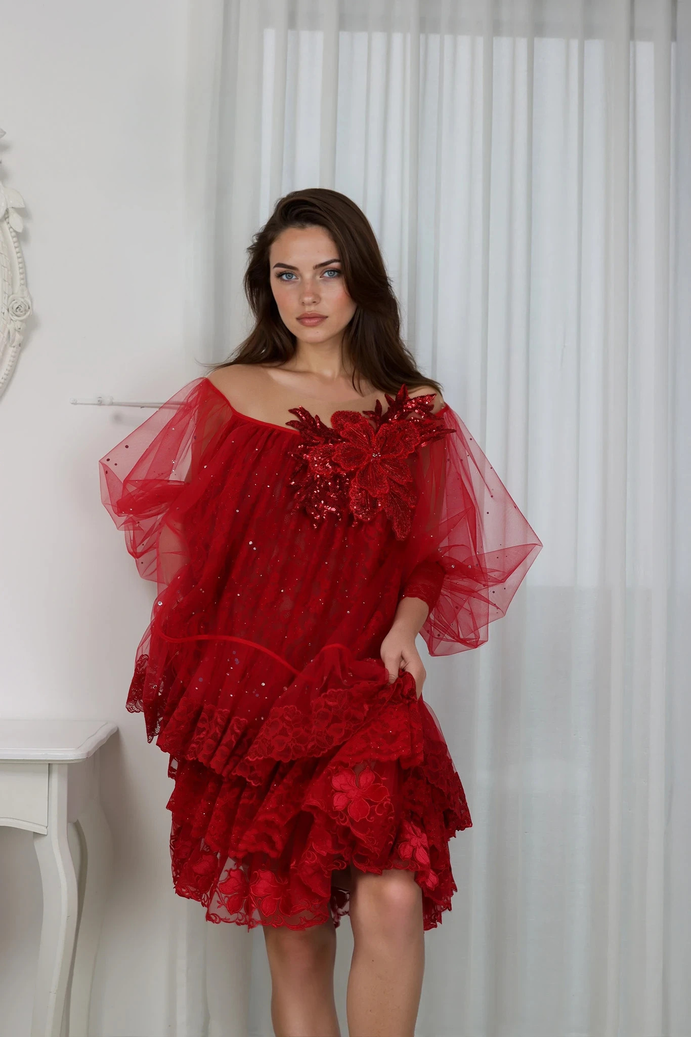 The Dina dress is a one-of-a-kind couture piece created for those who appreciate effortless elegance with a touch of drama. Crafted from sheer red tulle dusted with delicate sparkling accents, it floats gently around the silhouette, giving that ethereal, weightless impression.