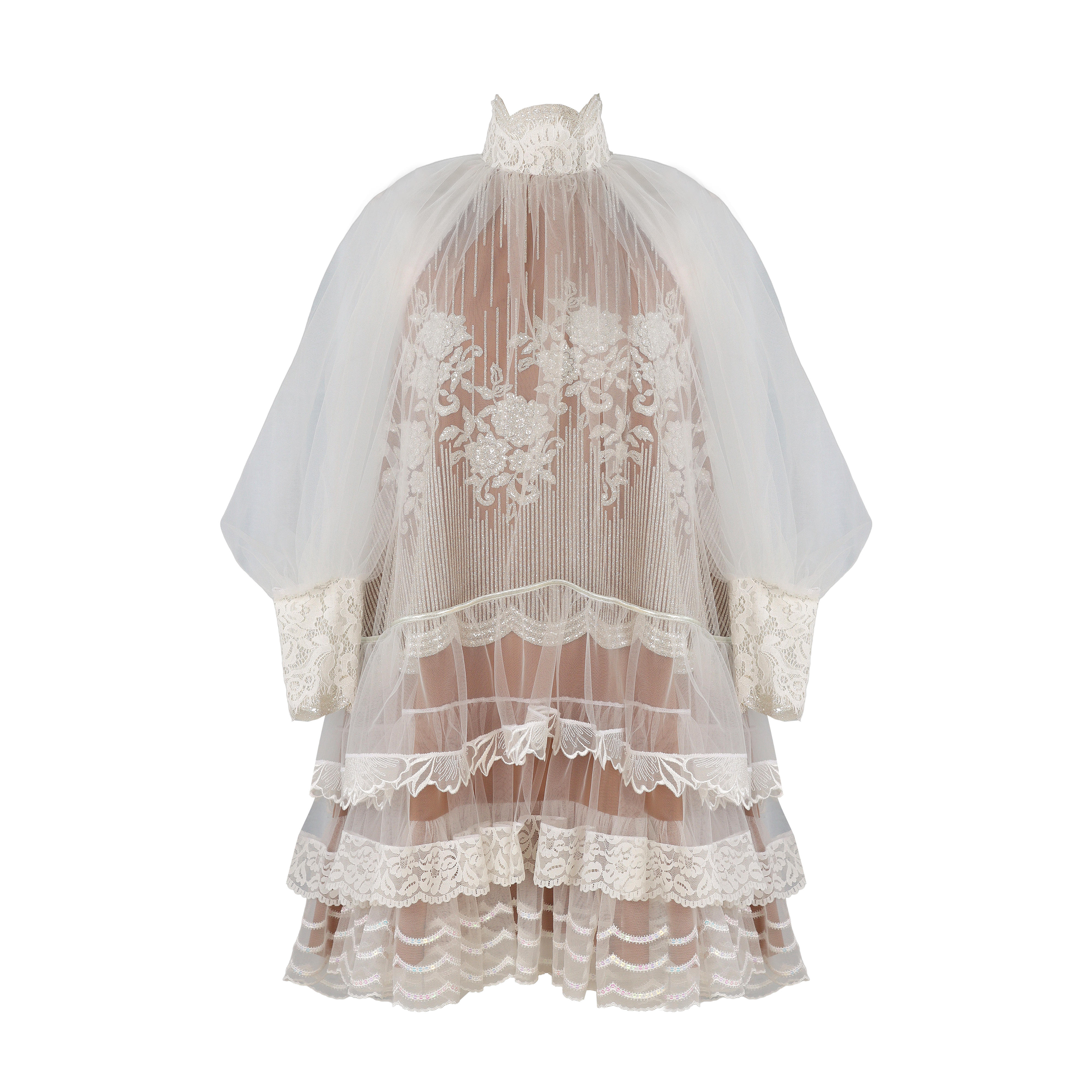 The Noelle Dress is a stunning white lace dress that exudes timeless elegance and feminine charm. This exquisite piece features voluminous, long balloon sleeves made from sheer white tulle, adding a dramatic yet refined touch to the silhouette. The dress is adorned with two rows of lace/tulle ruffles, each finished with delicate lace trims, creating a luxurious and textured look.