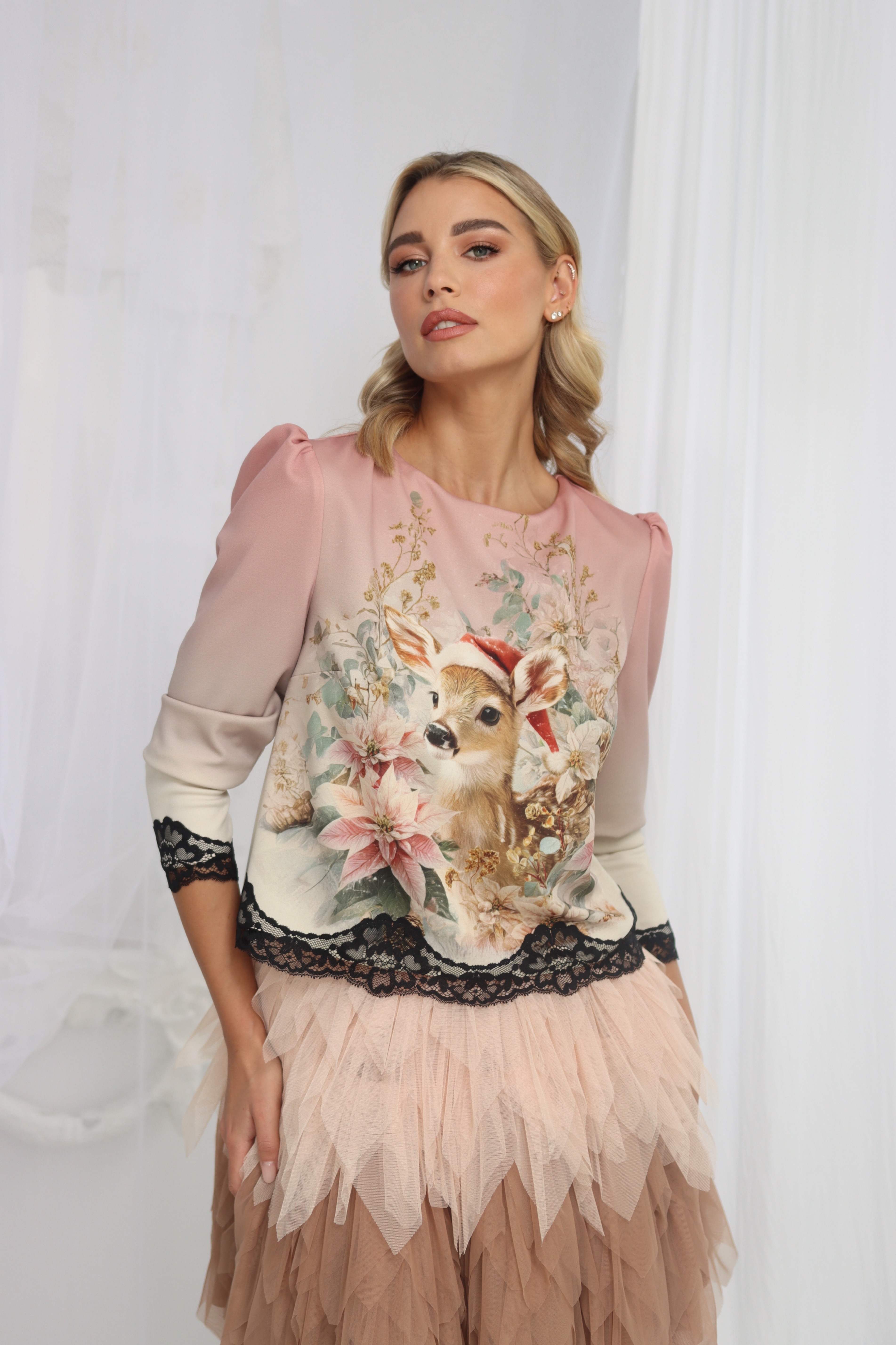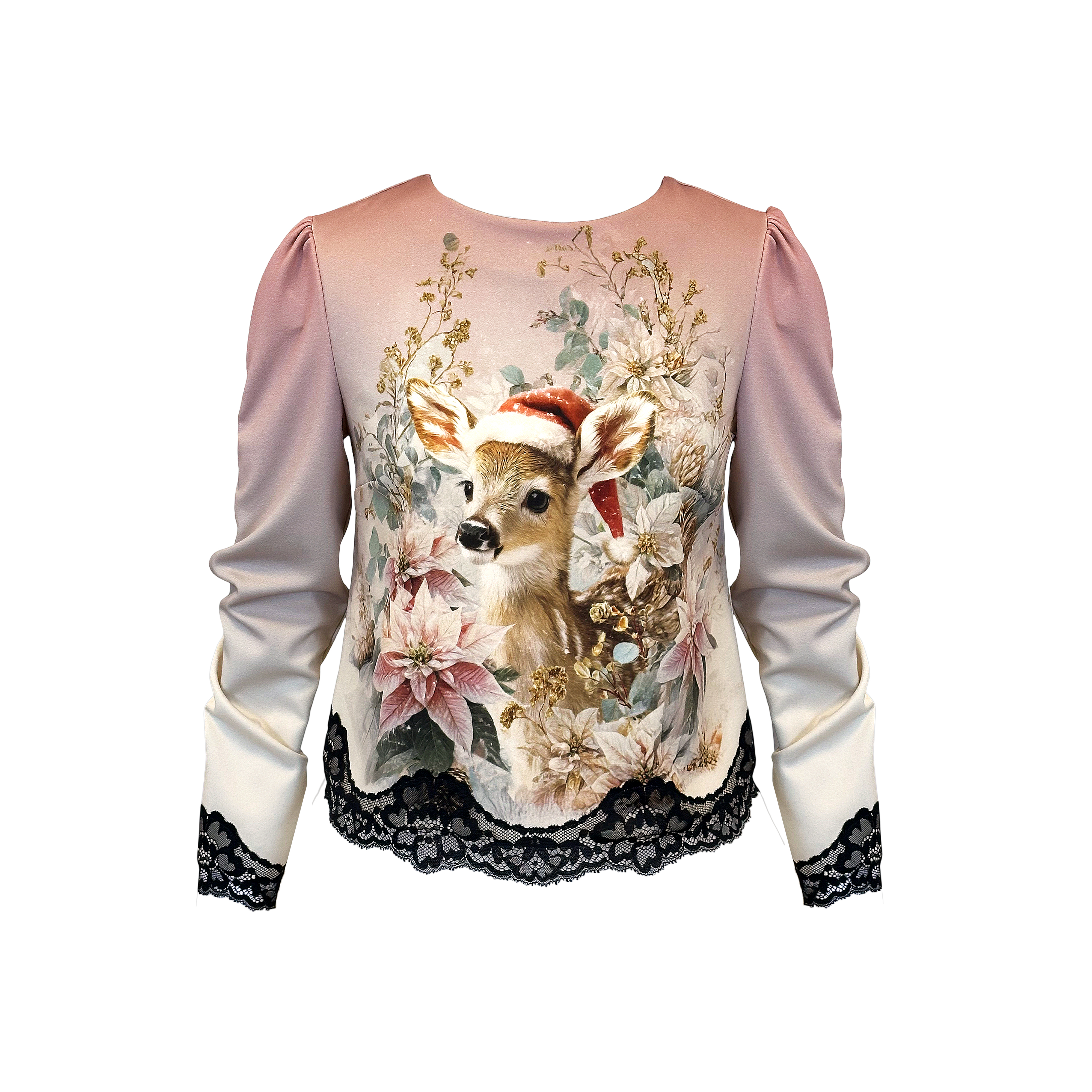 Elegantni top savršene duljine, osmišljen tako da podigne svaku kombinaciju – bilo da ga nosite na hlače  ili na ženstvenu suknju. Izrađen od udobne elastične skube, ukrašen originalnim Boudoir printom s raskošnim zimskim printom i dovršen  crnom čipkom na rubovima. Idealan izbor za sofisticirane dnevne ili večernje outfite, osobito kada želite naglasiti jednostavniji donji dio odjevne kombinacije.