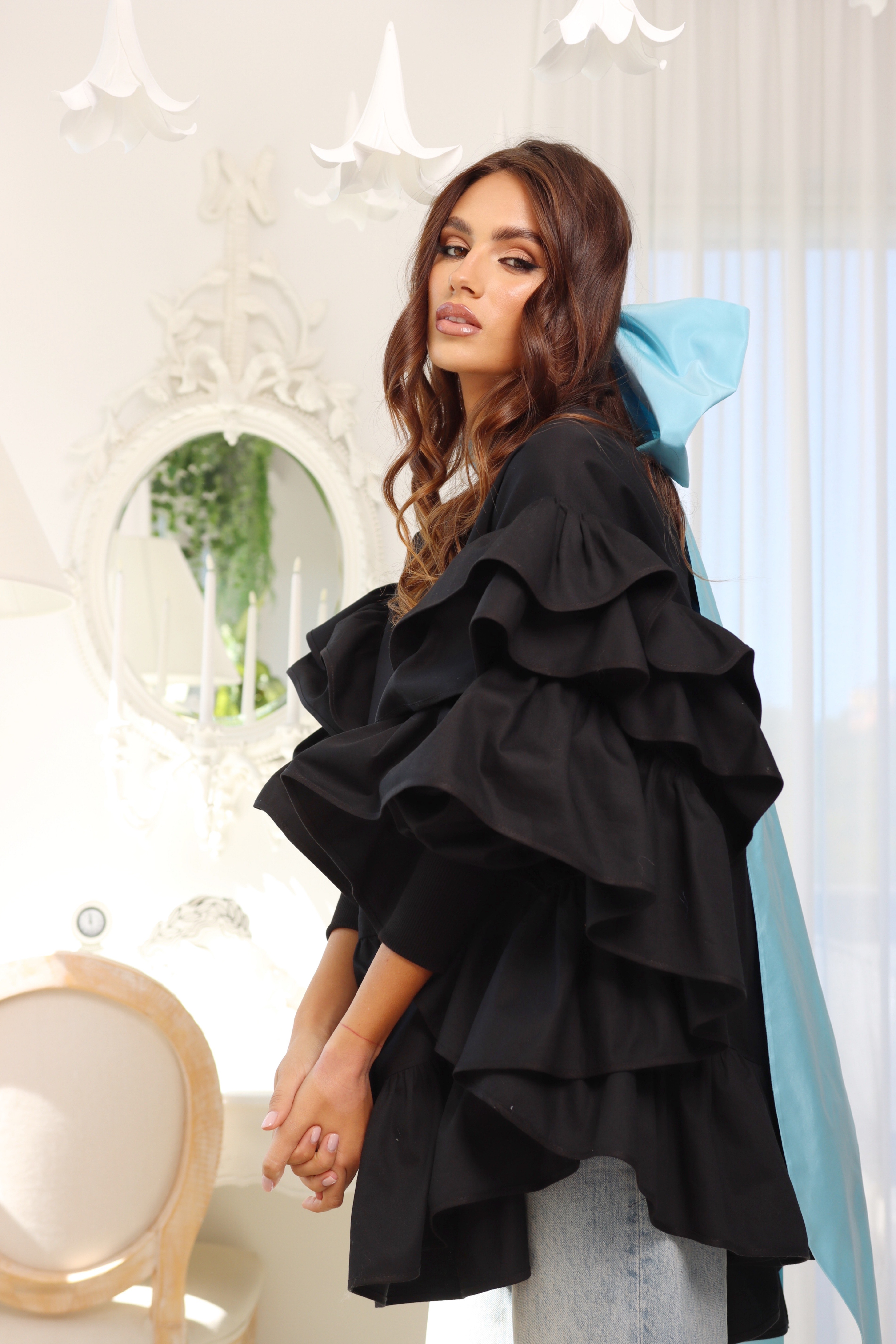 Prekrasna statement jakna izrađena od udobnog pamučnog kepera koja unosi dozu drame u svaku kombinaciju. Bogati volani na rukavima i asimetričnom donjem rubu daju joj razigran, couture izgled, dok zlatni patentni zatvarač sprijeda dodaje moderan, funkcionalan detalj. Dizajnirana je za dnevne modne kombinacije i savršena za prijelazno razdoblje kad želite istaknuti svoj stil, a pritom se osjećati udobno.
