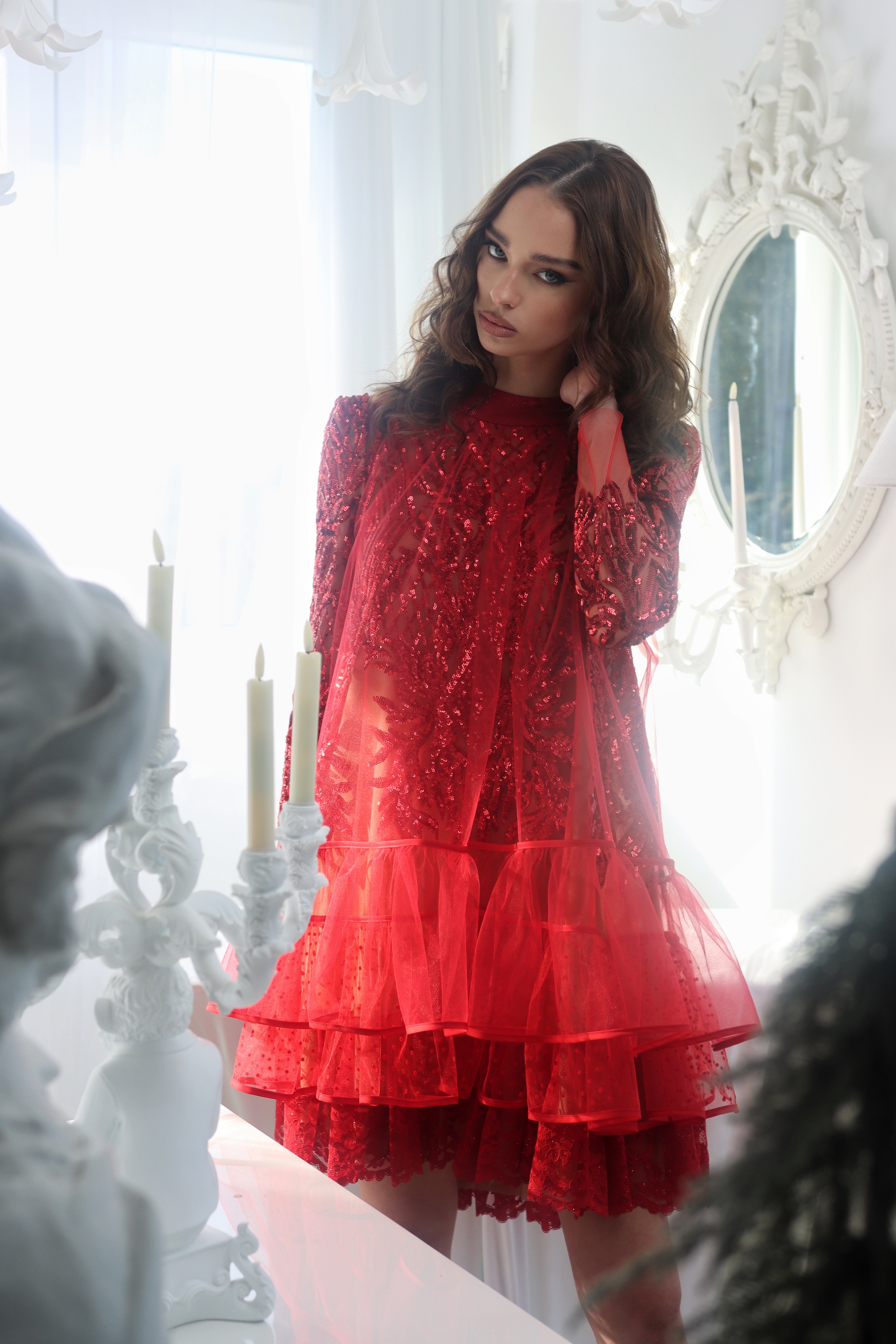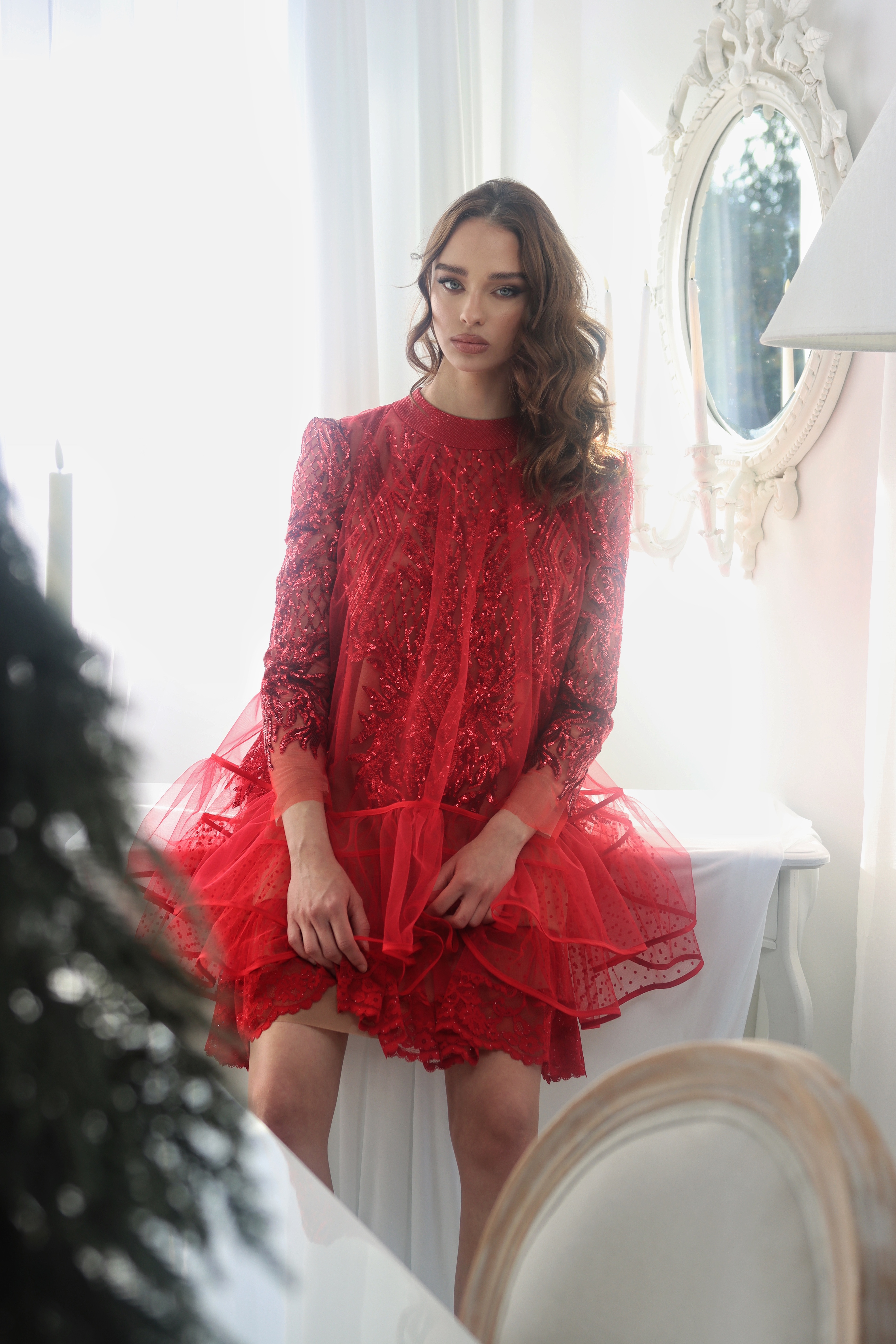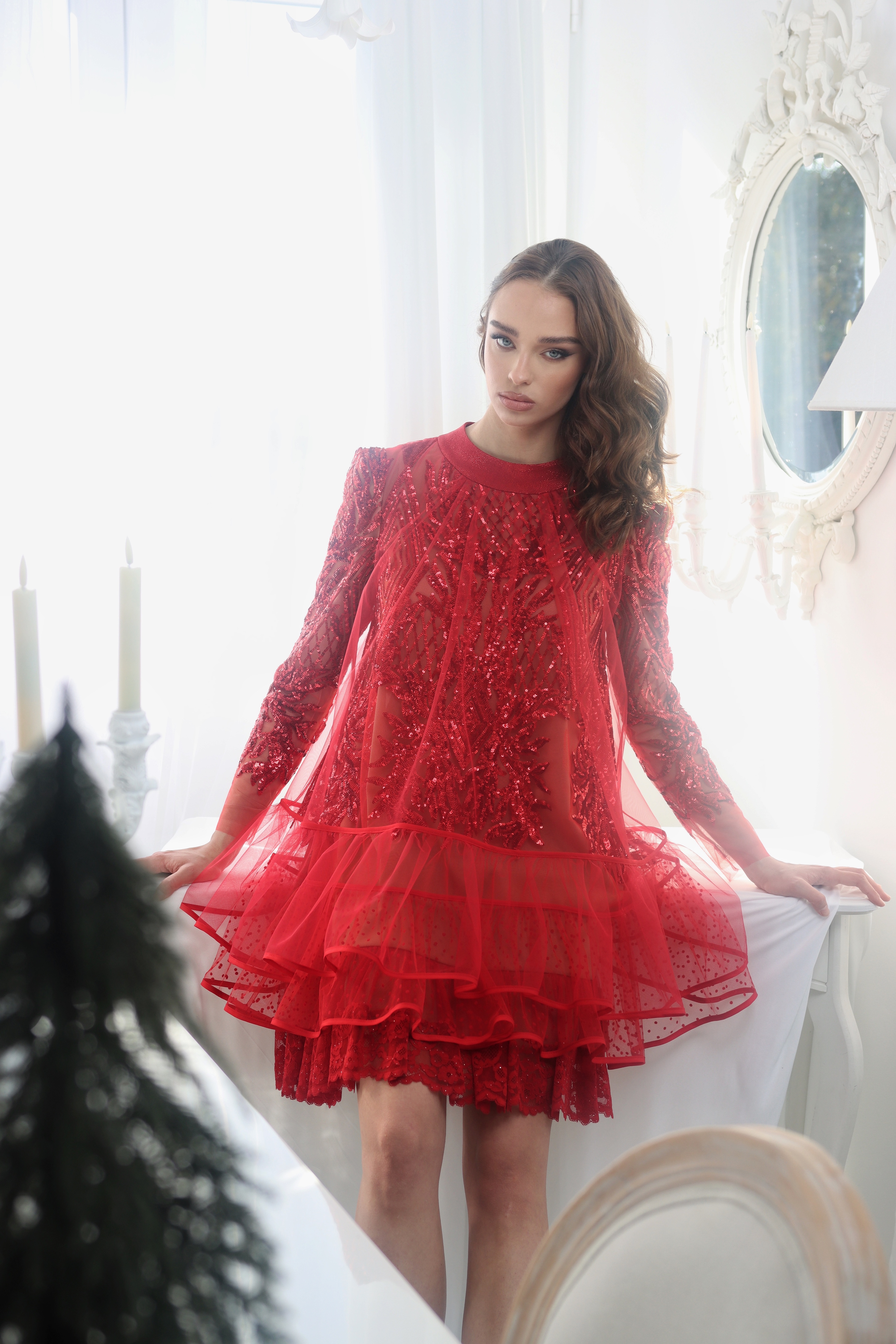 Luksuzna haljina iz snova za one koji ne pristaju na kompromise. Izrađena od svjetlucave crvene čipke, s vanjskim slojem od nježnog crvenog tila koji se prelijeva preko tijela poput eteričnog vela. Donji dio krase dva dvostruka volana na podstavi u boji kože, stvarajući raskošan volumen pri svakom pokretu.