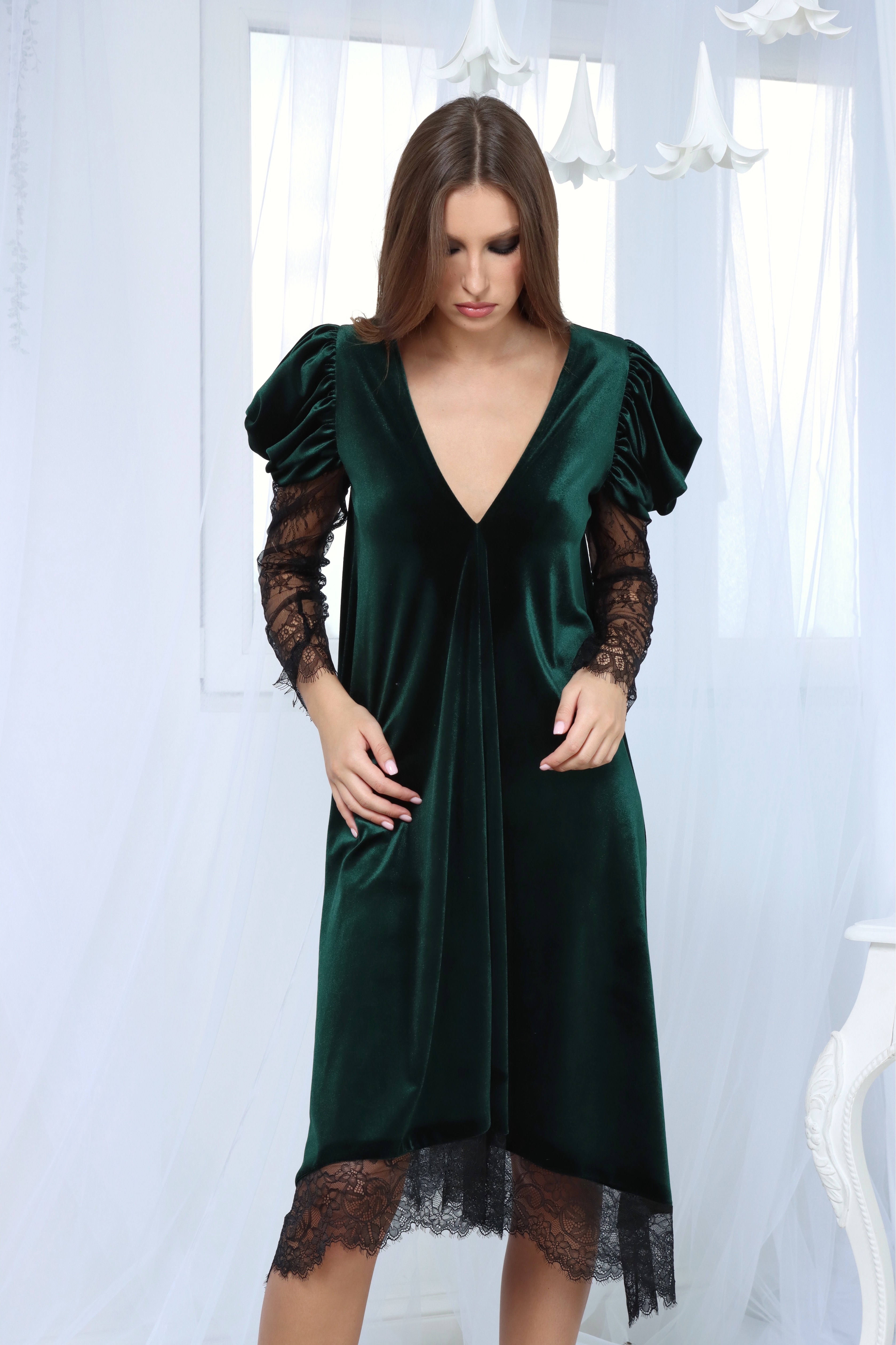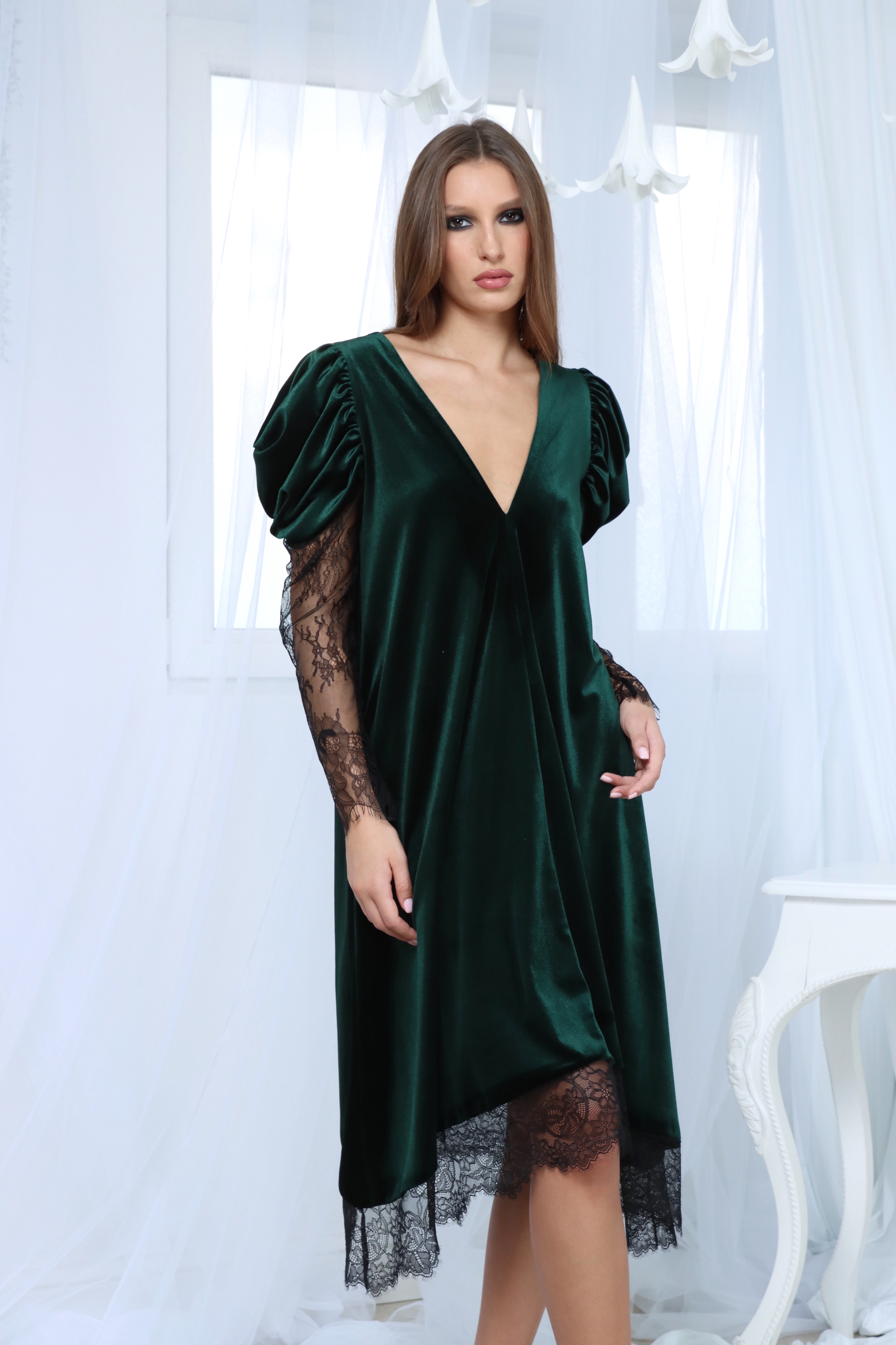 Rukavi su uski, kaskadnog kroja, završeni luksuznom crnom čipkom koja se nastavlja i na porubljeni donji rub haljine. Taj kontrast pliša i čipke stvara savršeni balans — dovoljno glamurozno za večernje prilike, dovoljno suptilno za posebne dnevne trenutke.