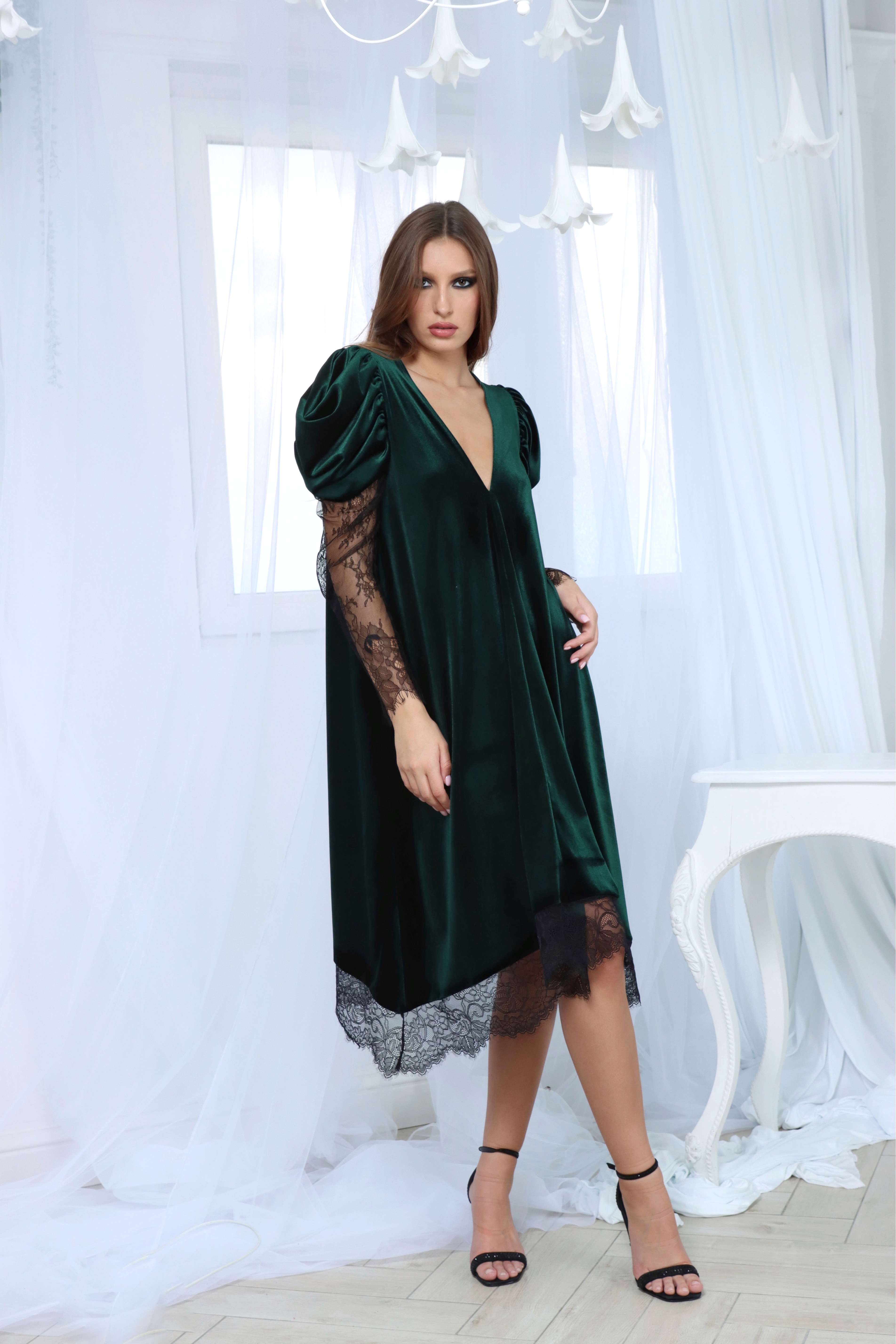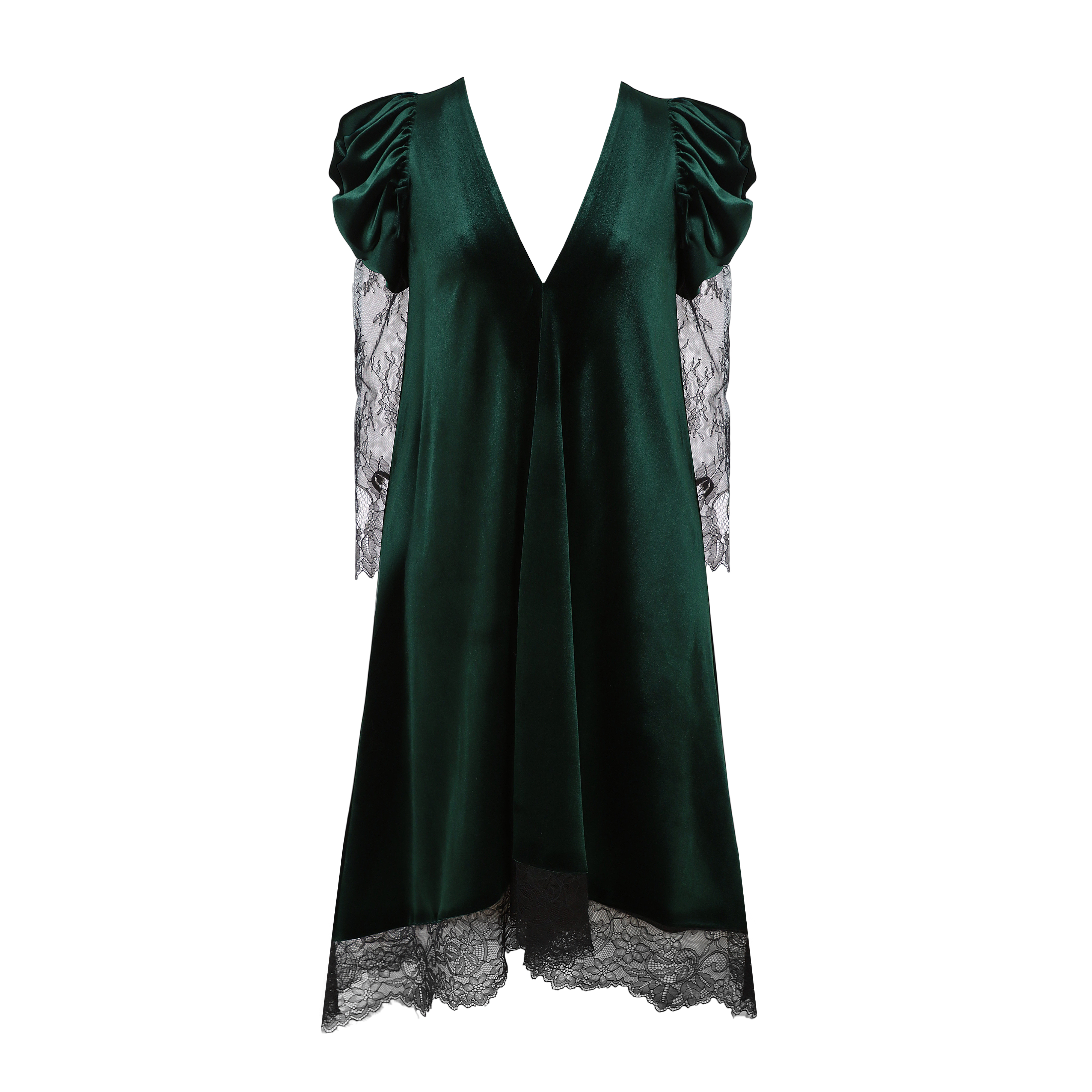 “Evergreen Iris Dress” je utjelovljenje tihe raskoši — tamnozeleni pliš koji pada meko poput šume pod snijegom, kroj koji naglašava figuru bez imalo pretencioznosti i čipka koja je toliko profinjena da djeluje gotovo eterično.