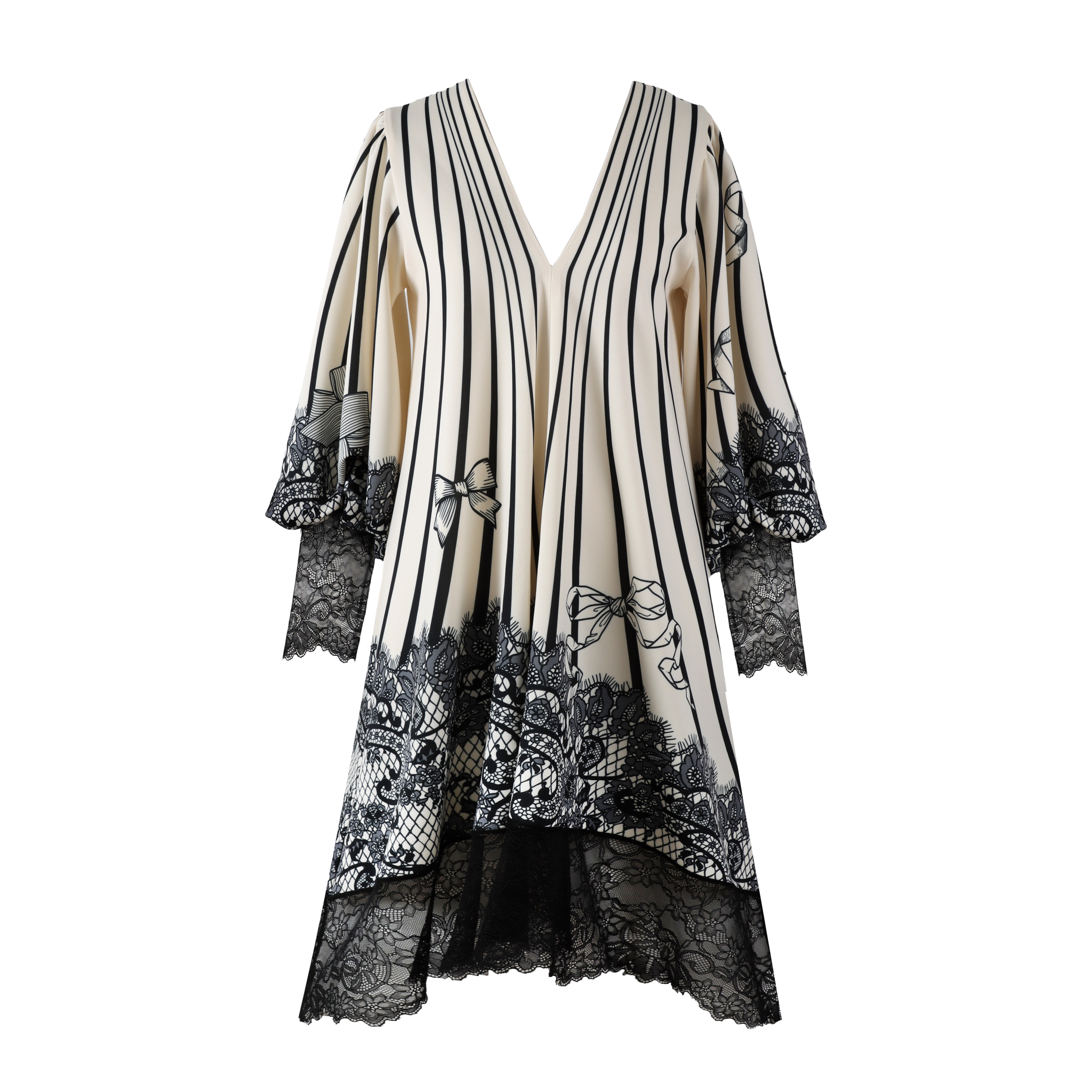 Komotan kroj čini ovu haljinu izuzetno zahvalnom za nošenje, dok raskošni rukavi završeni crnim čipkastim renderima dodaju dozu luksuza i romantične dramatike. Donji rub haljine dodatno je naglašen širokom crnom čipkom, koja cijelom komadu daje prepoznatljiv Boudoir potpis.