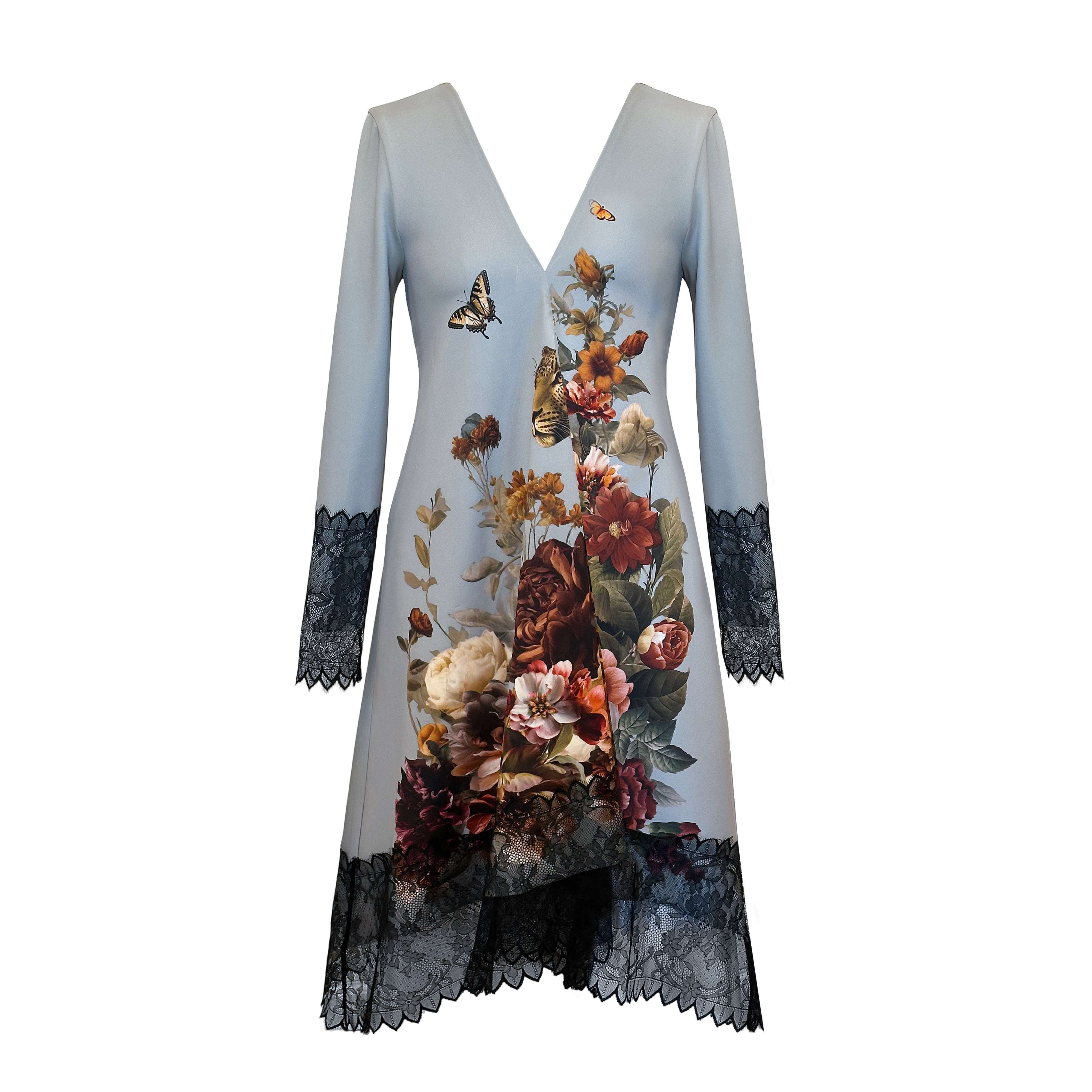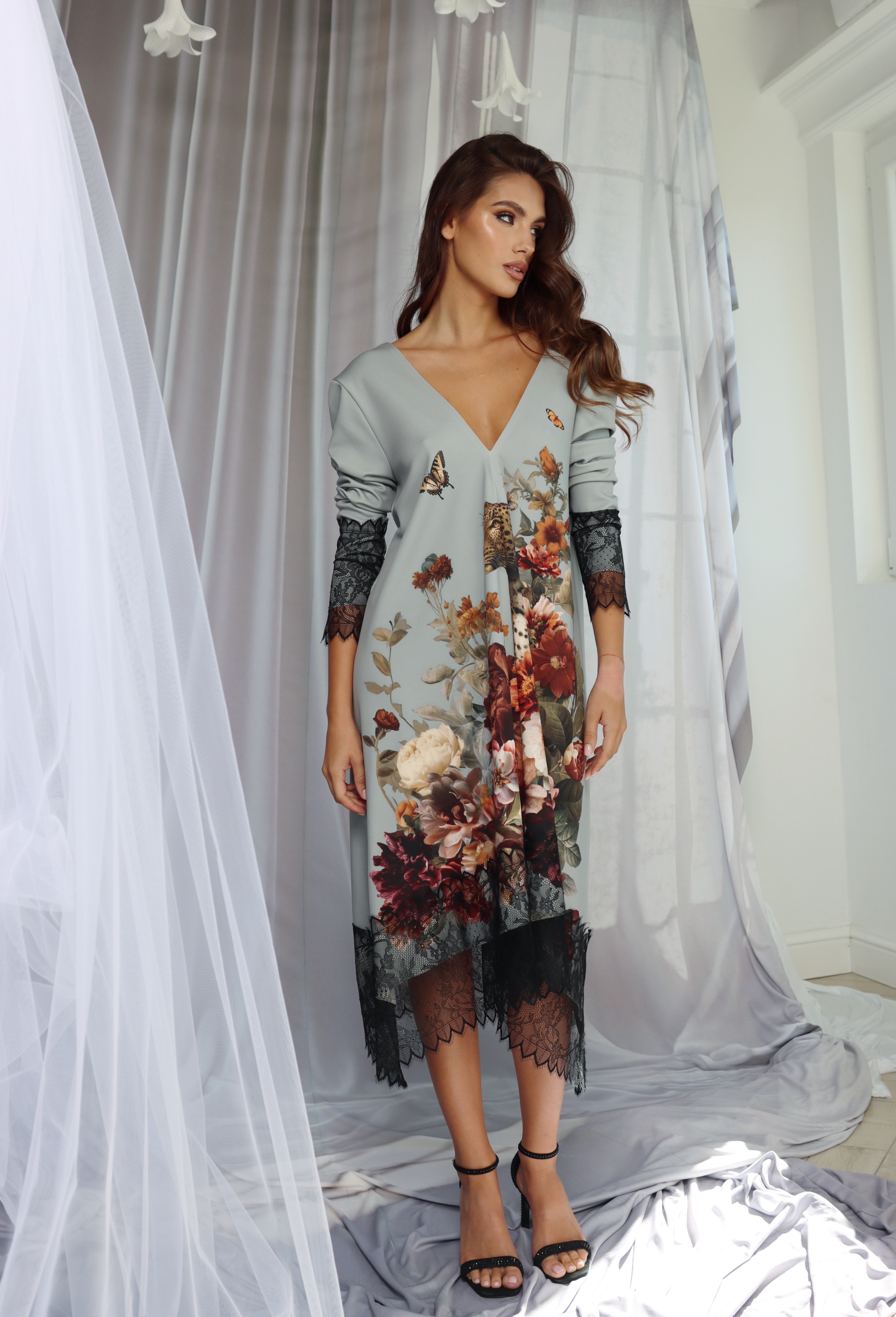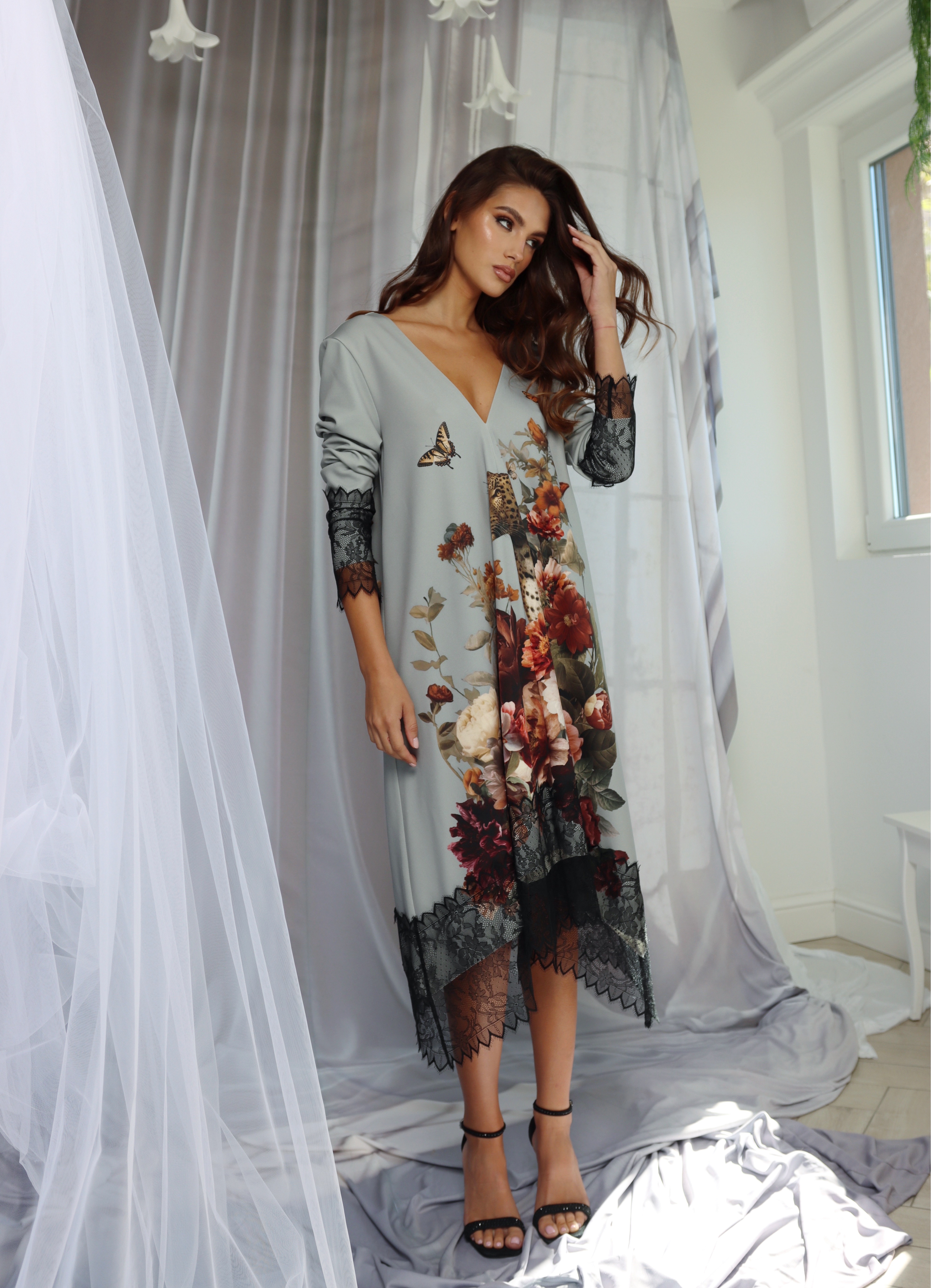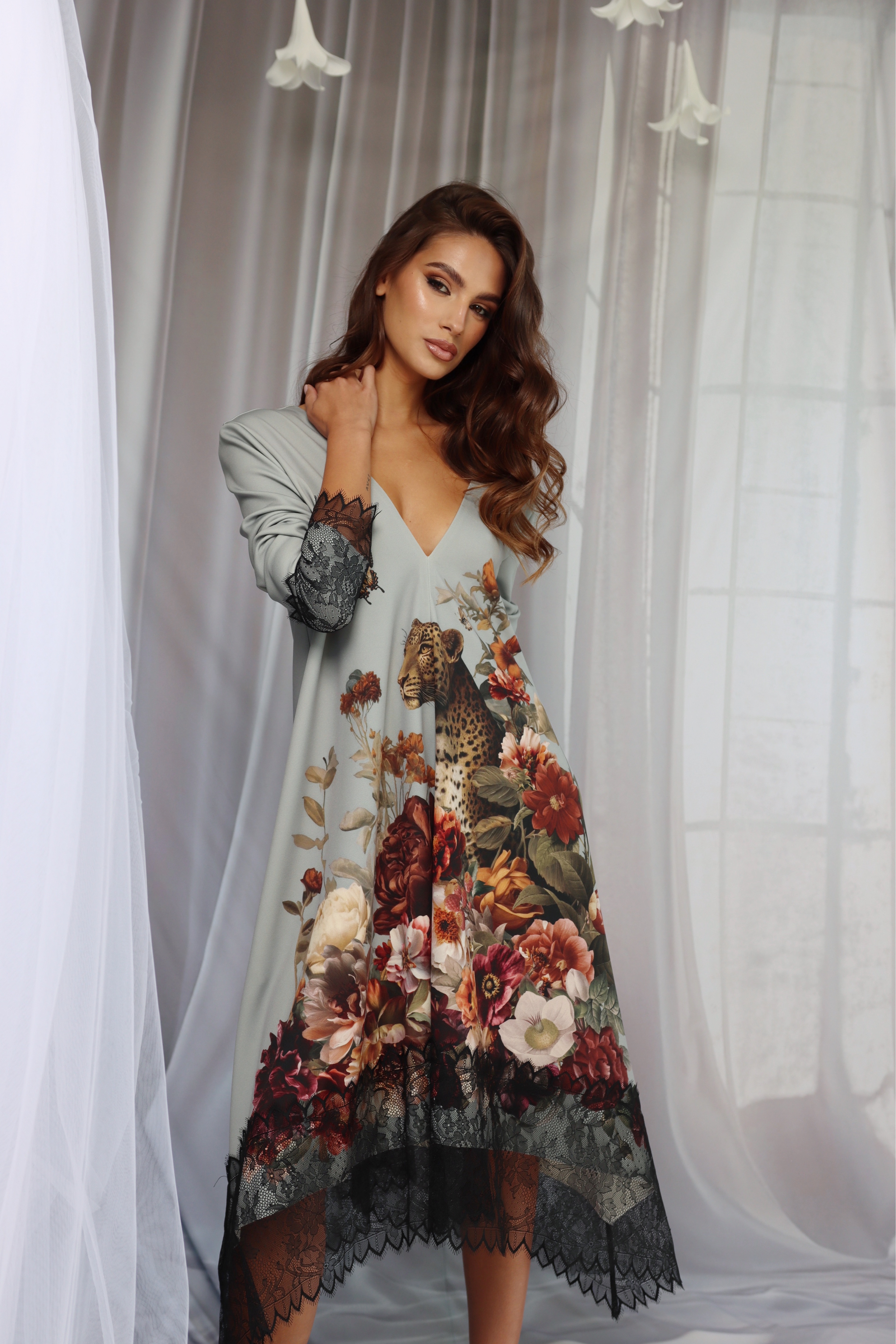 Elegantna midi haljina s V izrezom sprijeda i straga, izrađena od udobne elastične skube koja savršeno prati liniju tijela. Originalni Boudoir print s raskošnim cvjetovima i leopardom daje joj profinjenu, umjetničku notu, dok dugi uski rukavi i široka crna čipka na rubovima rukava i donjem dijelu haljine dodaju dašak luksuza. Idealna za svečane i elegantne prilike – dovoljno posebna za večernji izlazak, ali i suptilna za dnevne svečanosti.