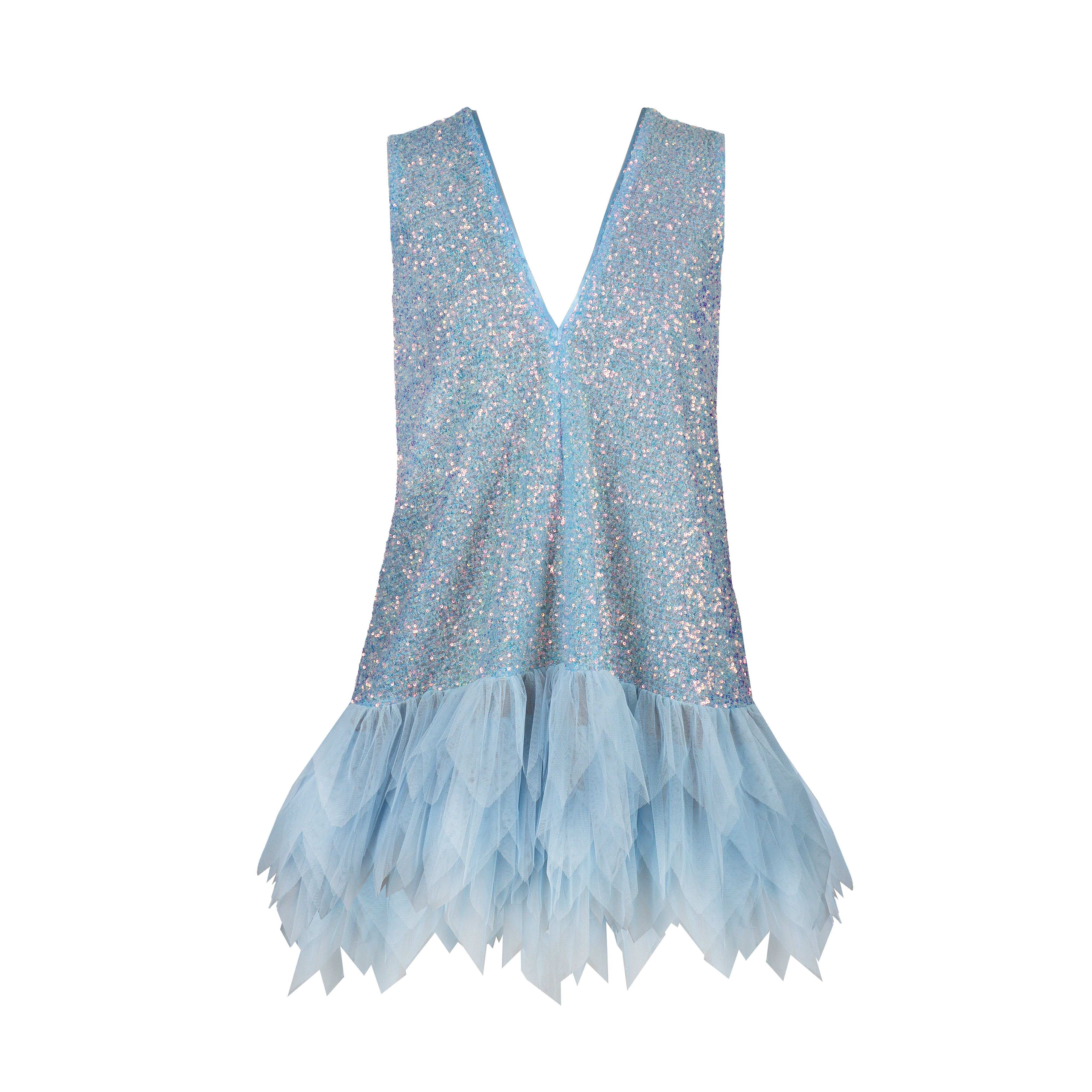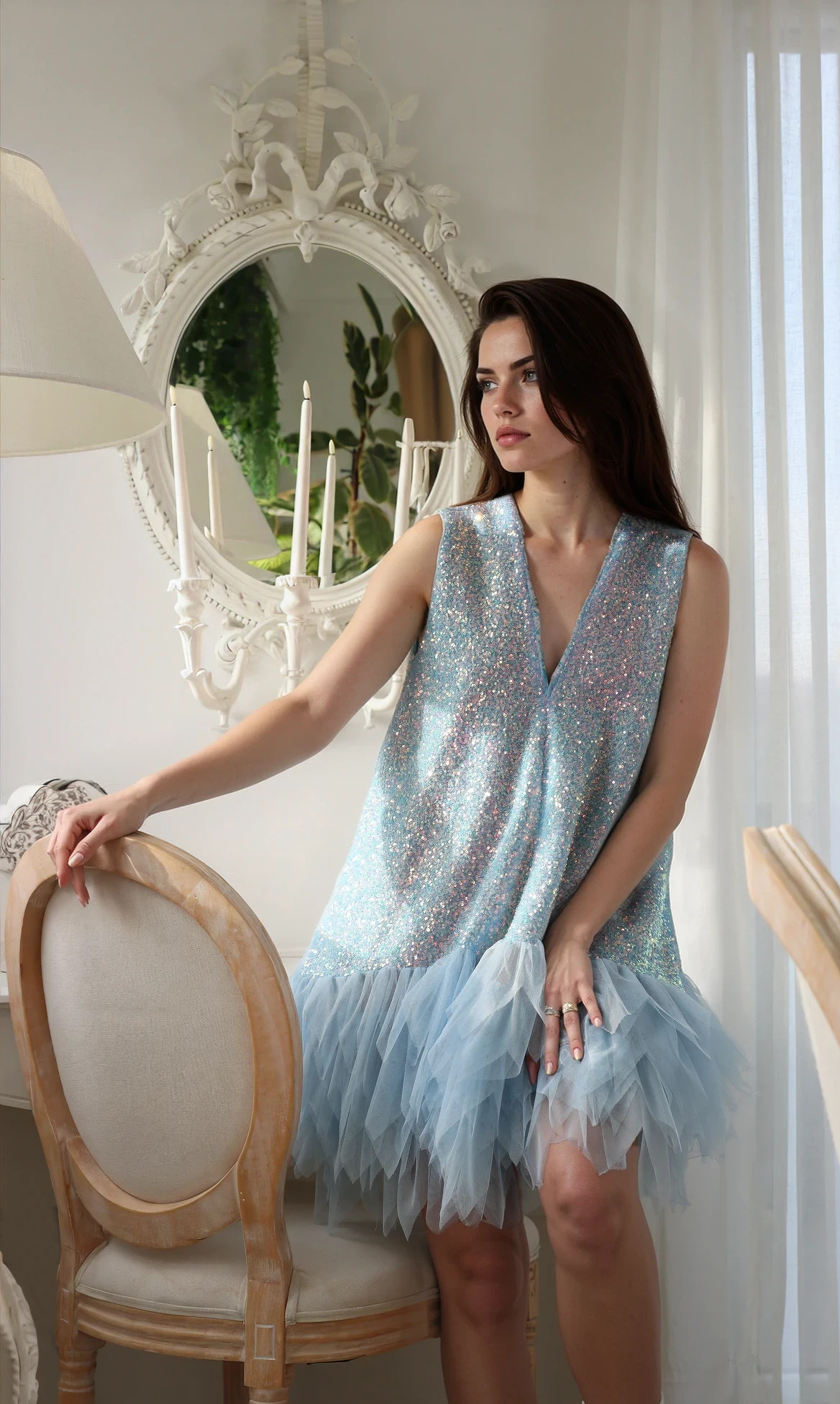 Lena Dress je komad koji osvaja na prvi pogled — kombinacija bogato svjetlucavog gornjeg dijela i raskošnih, paperjastih volana od nježnog tila u baby blue nijansi. Silueta je lagano A-kroja, mekano pada, a duboki V-izrez sprijeda i straga daje upravo onu sofisticiranost koja se ne mora truditi da bi bila primijećena.