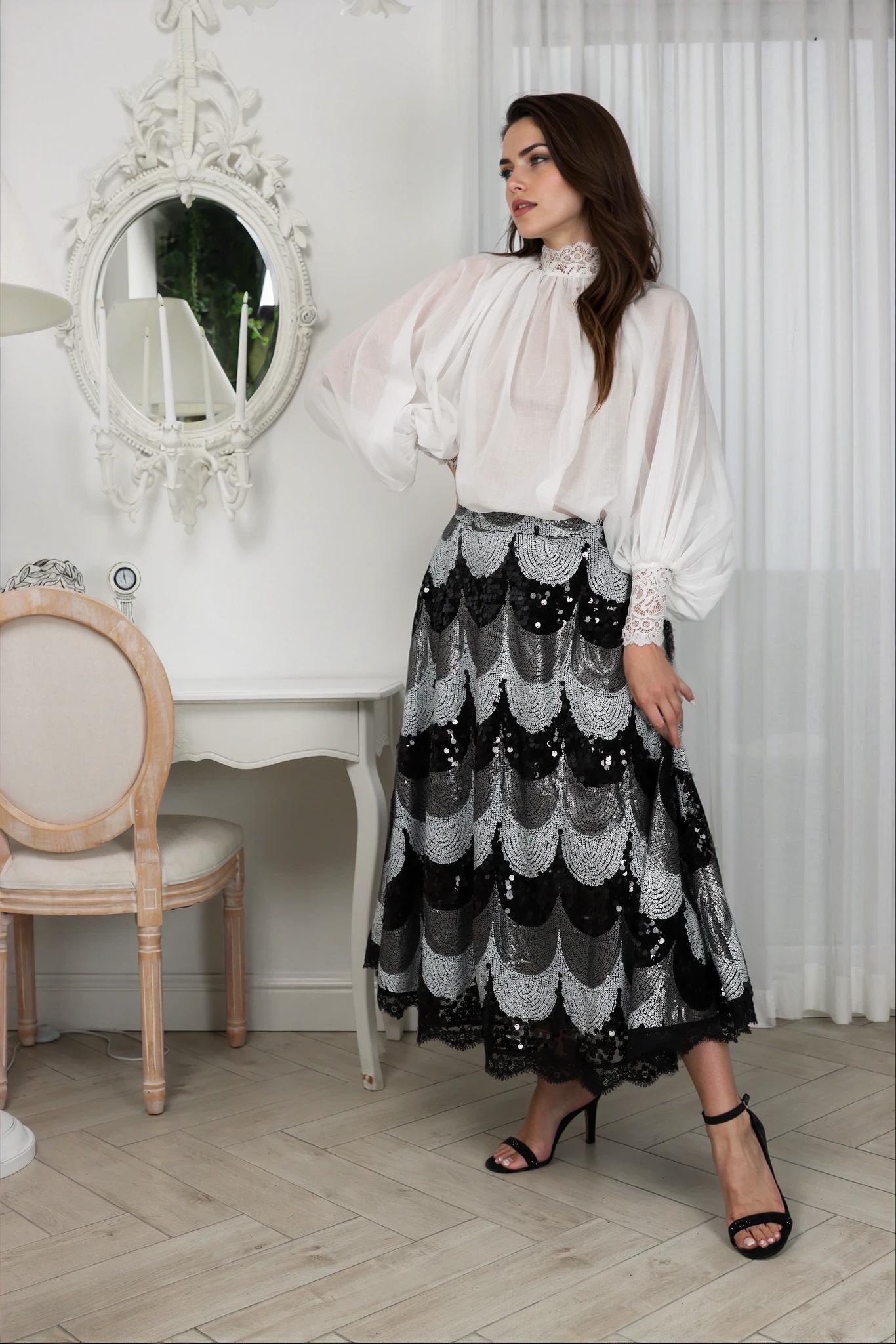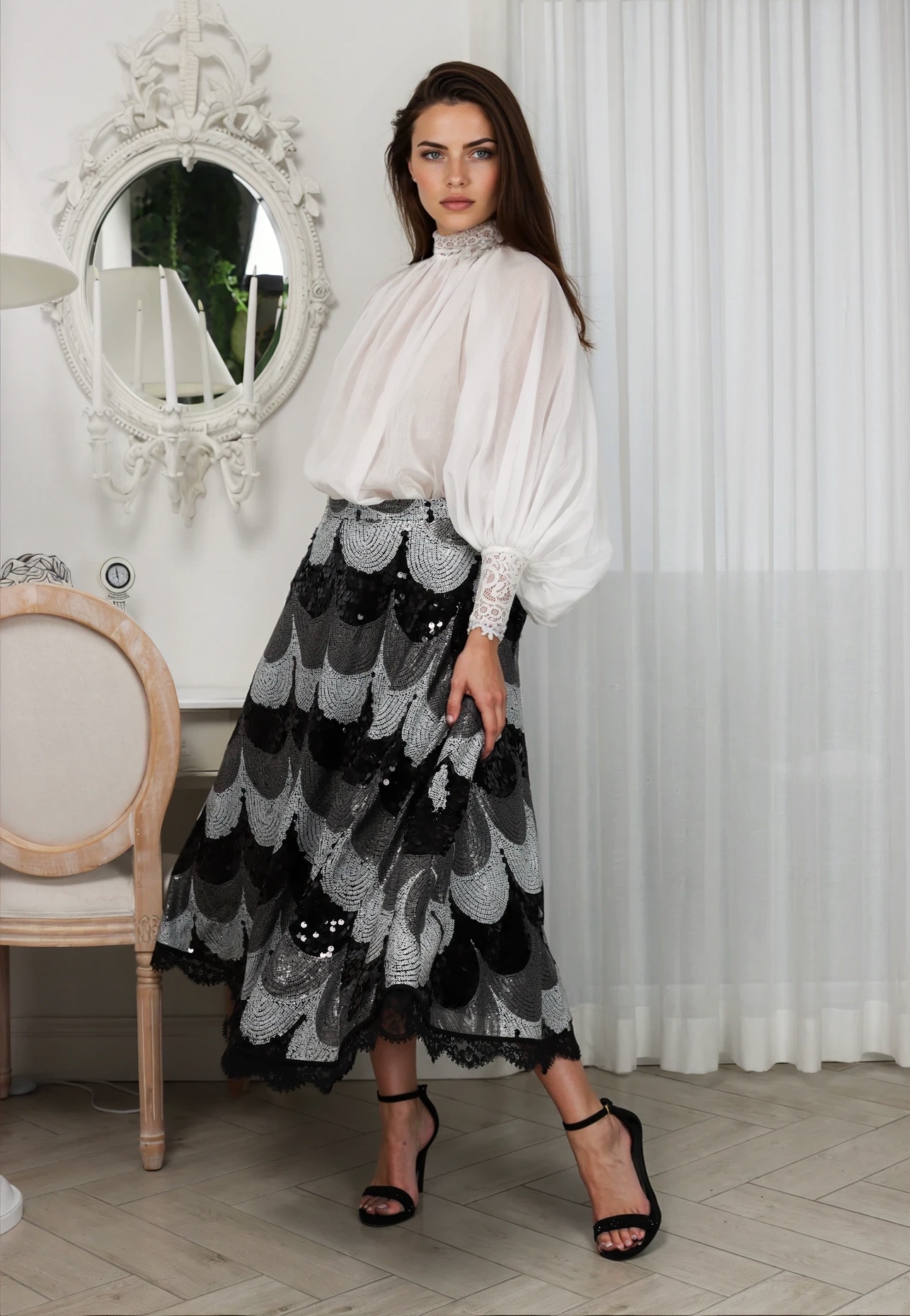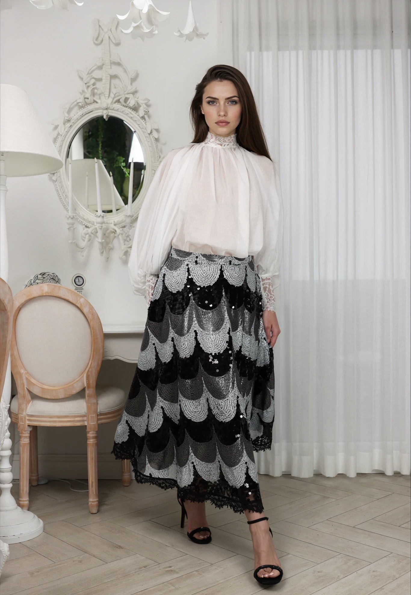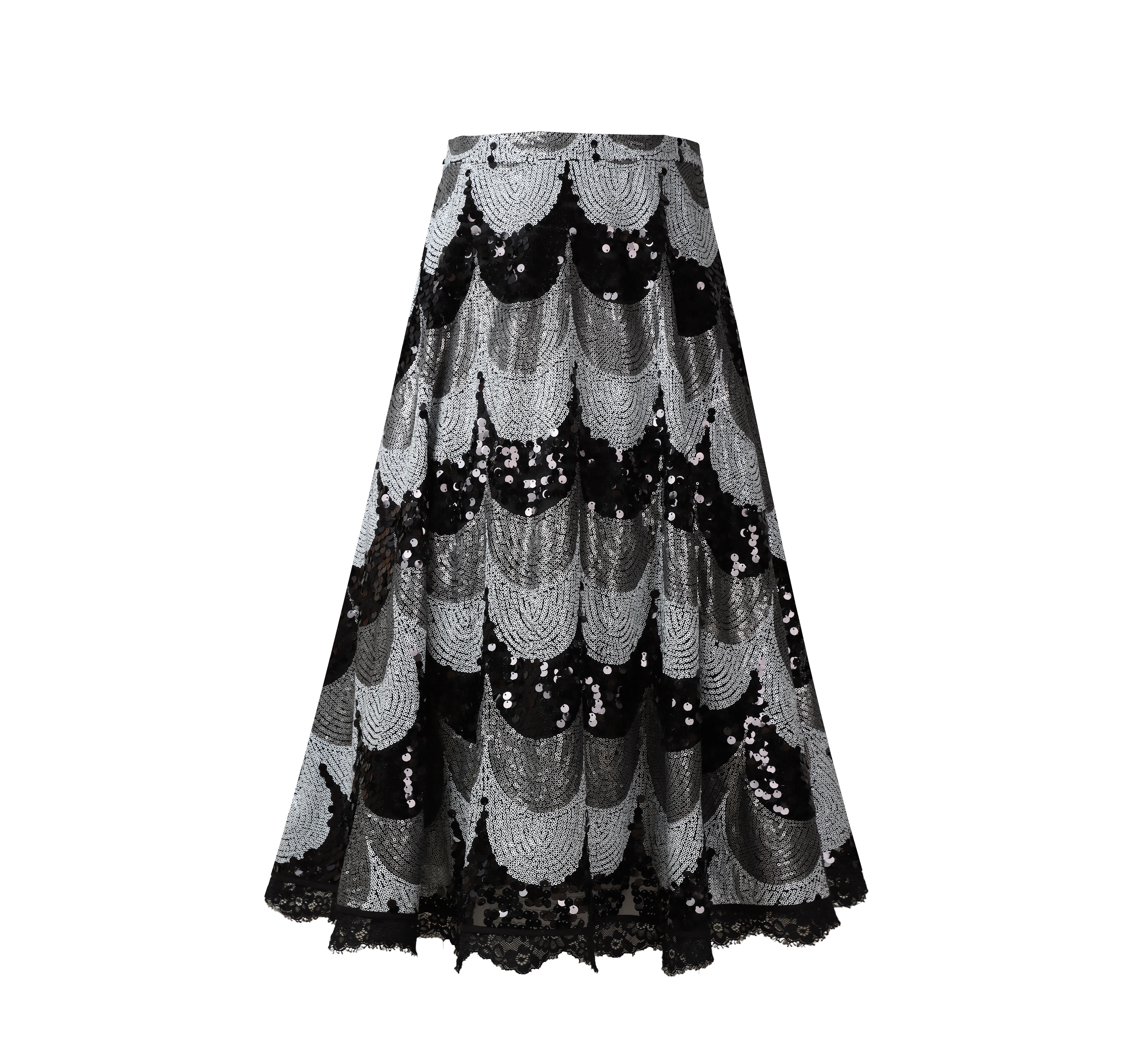 Melody skirt midi duljine pravi je statement komad – raskošna, efektna i bezvremenska. Izrađena je od luksuznog materijala s trobojnim ljuskicama koje stvaraju bogatu teksturu i suptilan sjaj pri svakom koraku. Suknja se prekrasno leluja u hodu, a lagano šuštanje ljuskica daje joj onaj couture moment koji se pamti.
