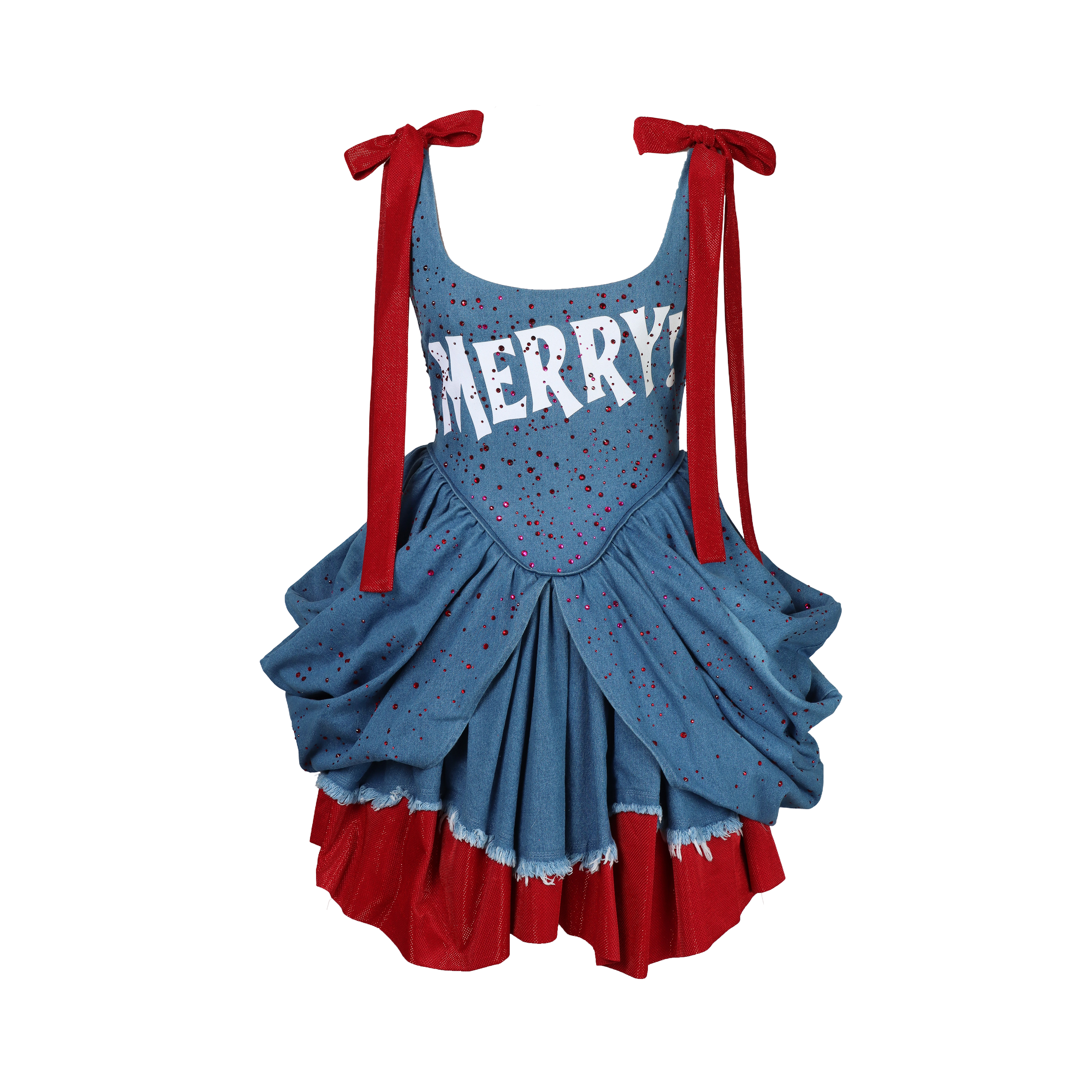Unikatna  haljina od stonewashed jansa, baroknog kroja, sa crvenim tregerima koji se vežu, ukrašena raskošnim volanom, kristalima i printom.