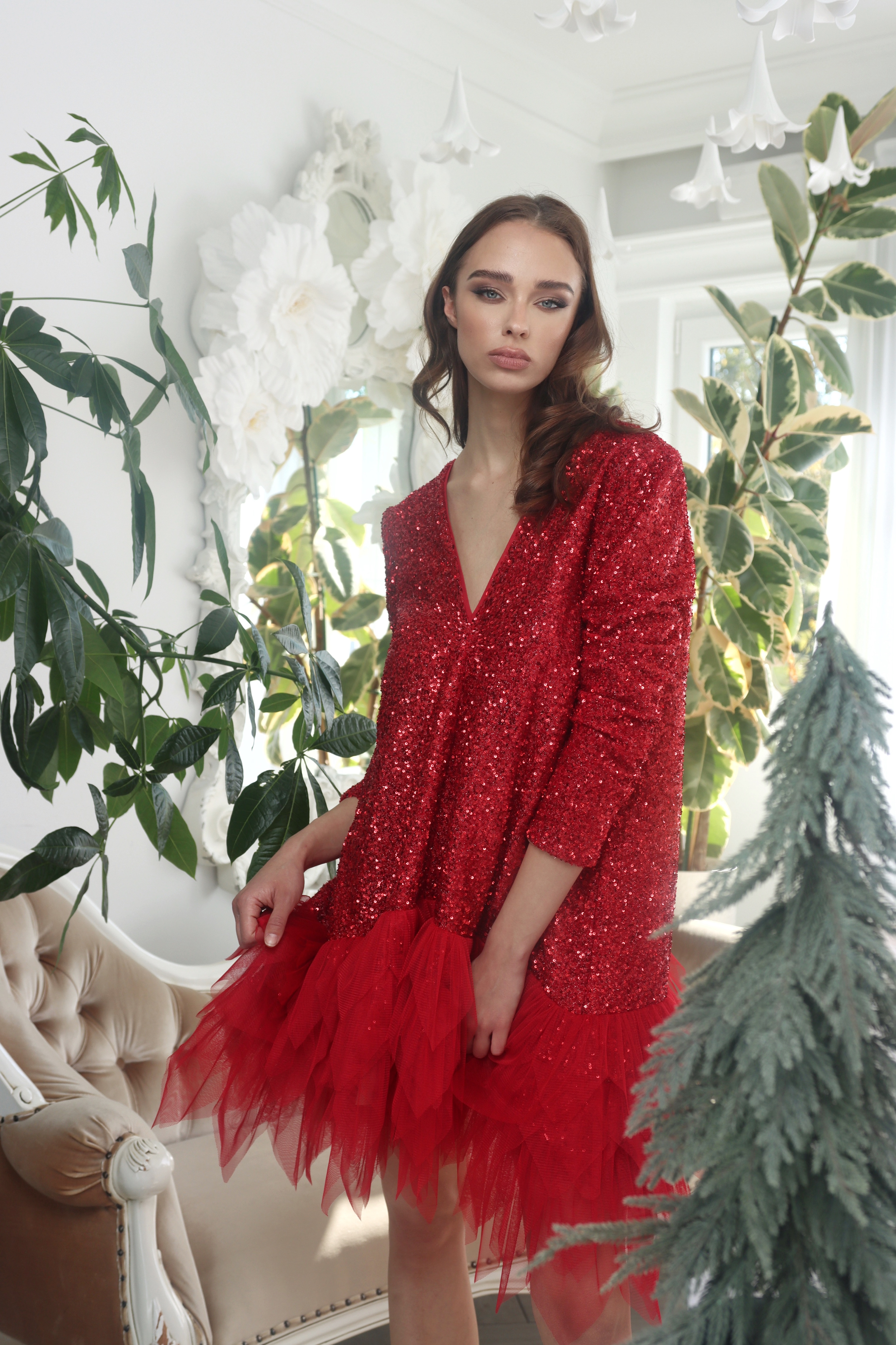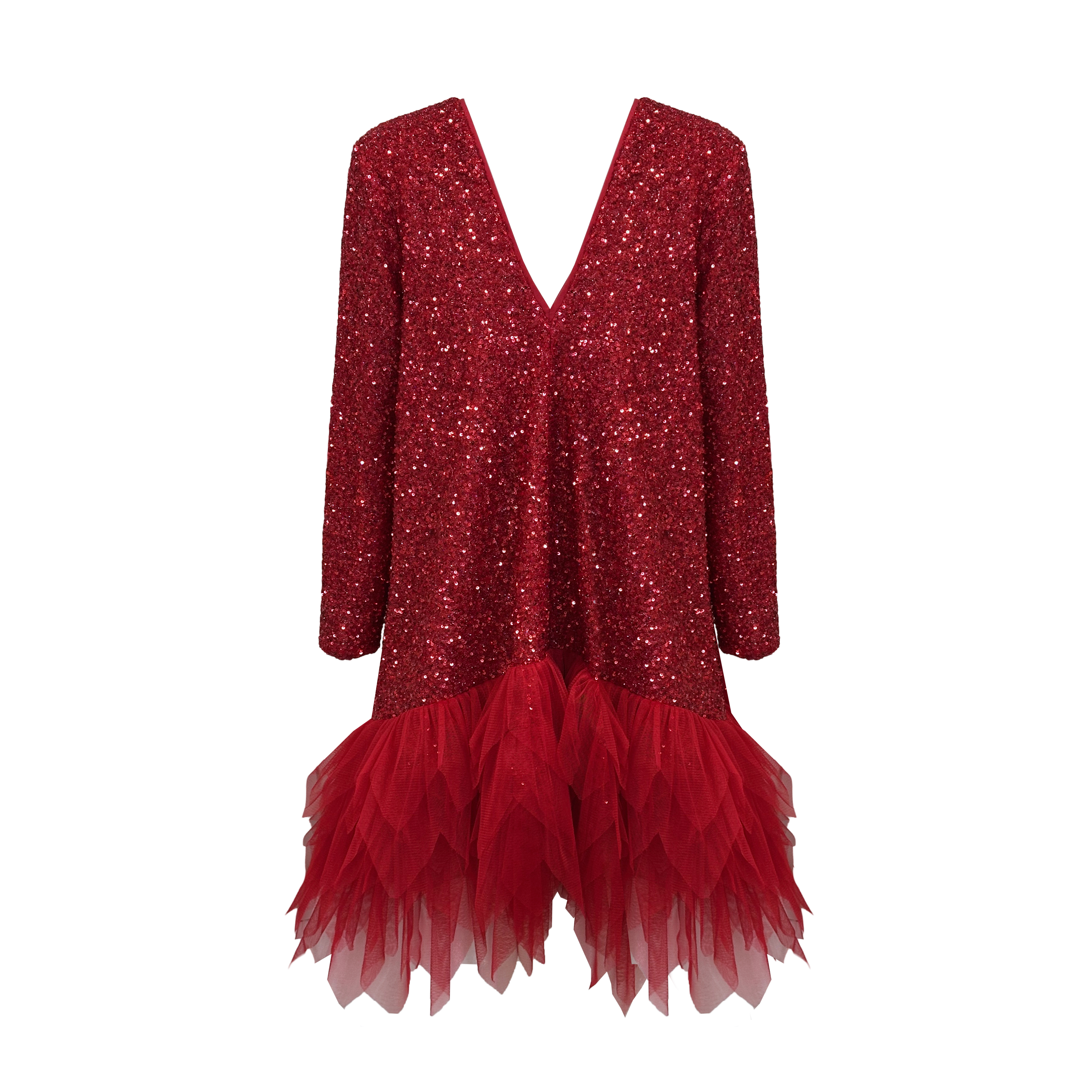 Haljina koja spaja glamur šljokica i dramatičnost slojevitog tila. Gornji dio, izveden od crvenih sjajnih šljokica, naglašen je V-izrezom koji dodaje dozu senzualnosti. Donji dio haljine oblikovan je u bogate slojeve laganog tila, stvarajući voluminoznu i efektnu siluetu. Momo Dress savršen je izbor za večernje izlaske i posebne prilike kada želite izgledati moćno i nezaboravno.