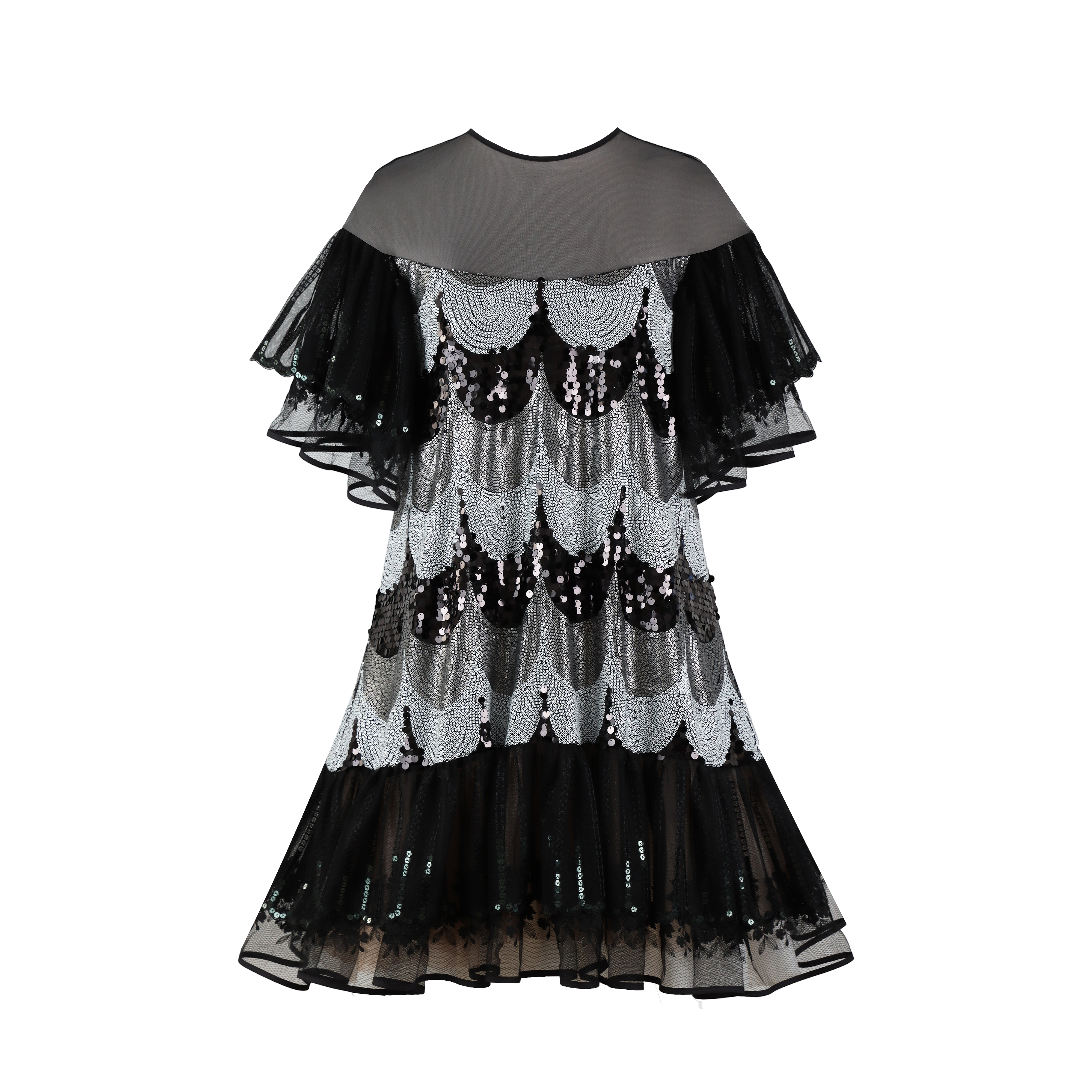 Raskošna svečana haljina A-kroja izrađena od luksuznog materijala bogato ukrašenog ljuskicama i šljokicama, s elegantnim uzorkom u crnoj i srebrnoj boji. Haljina odiše profinjenošću i vizualnom dubinom, stvarajući snažan, ali sofisticiran dojam.