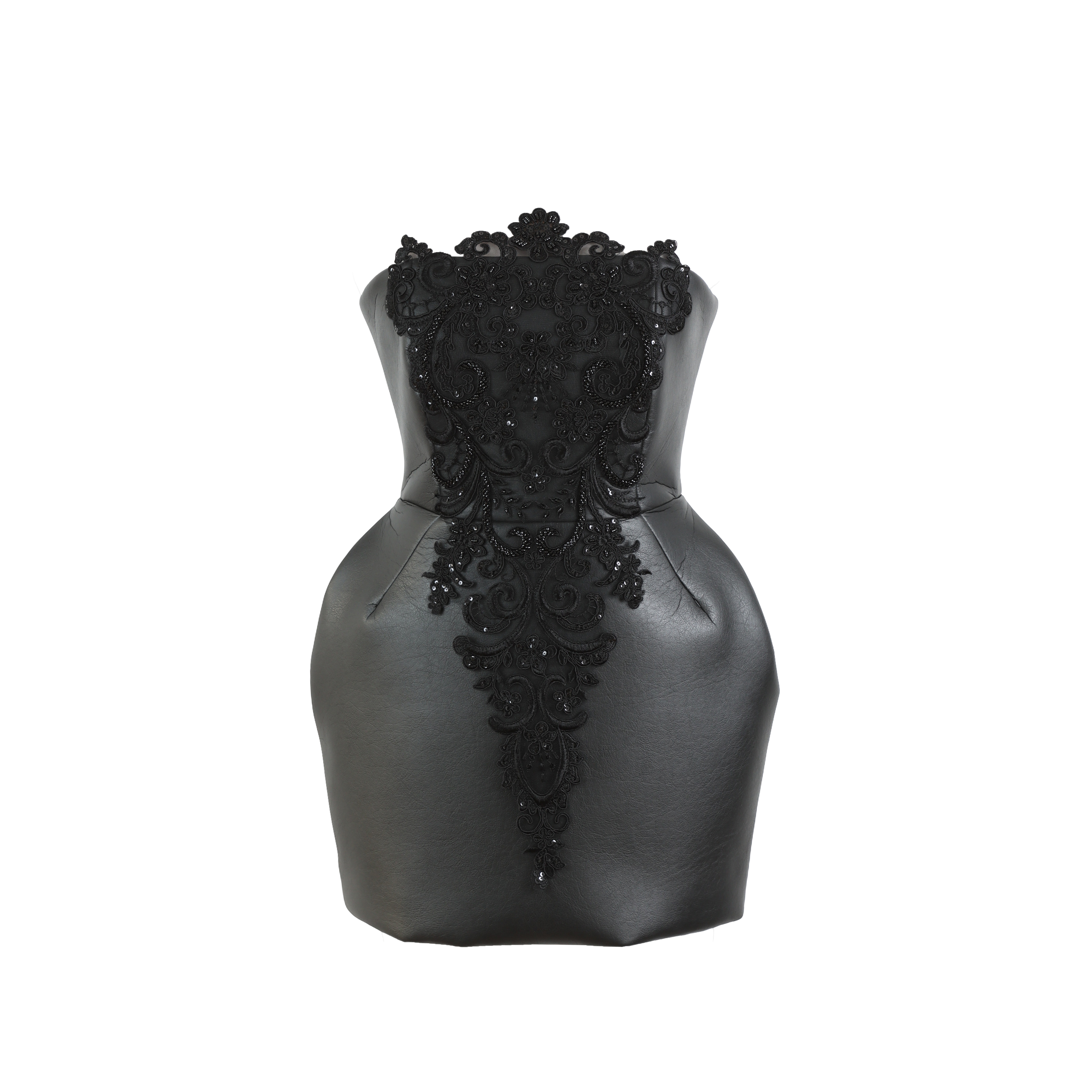 Posebnost ovog komada je ručno našivena aplikacija na prednjem dijelu, bogata i detaljna, koja haljini daje svečani, luksuzni karakter i podiže je iznad klasične “party” haljine. Upravo taj kontrast – strukturirani neopren s kožnim efektom i ornamentalna aplikacija – čini ovu haljinu snažnim modnim statementom.
