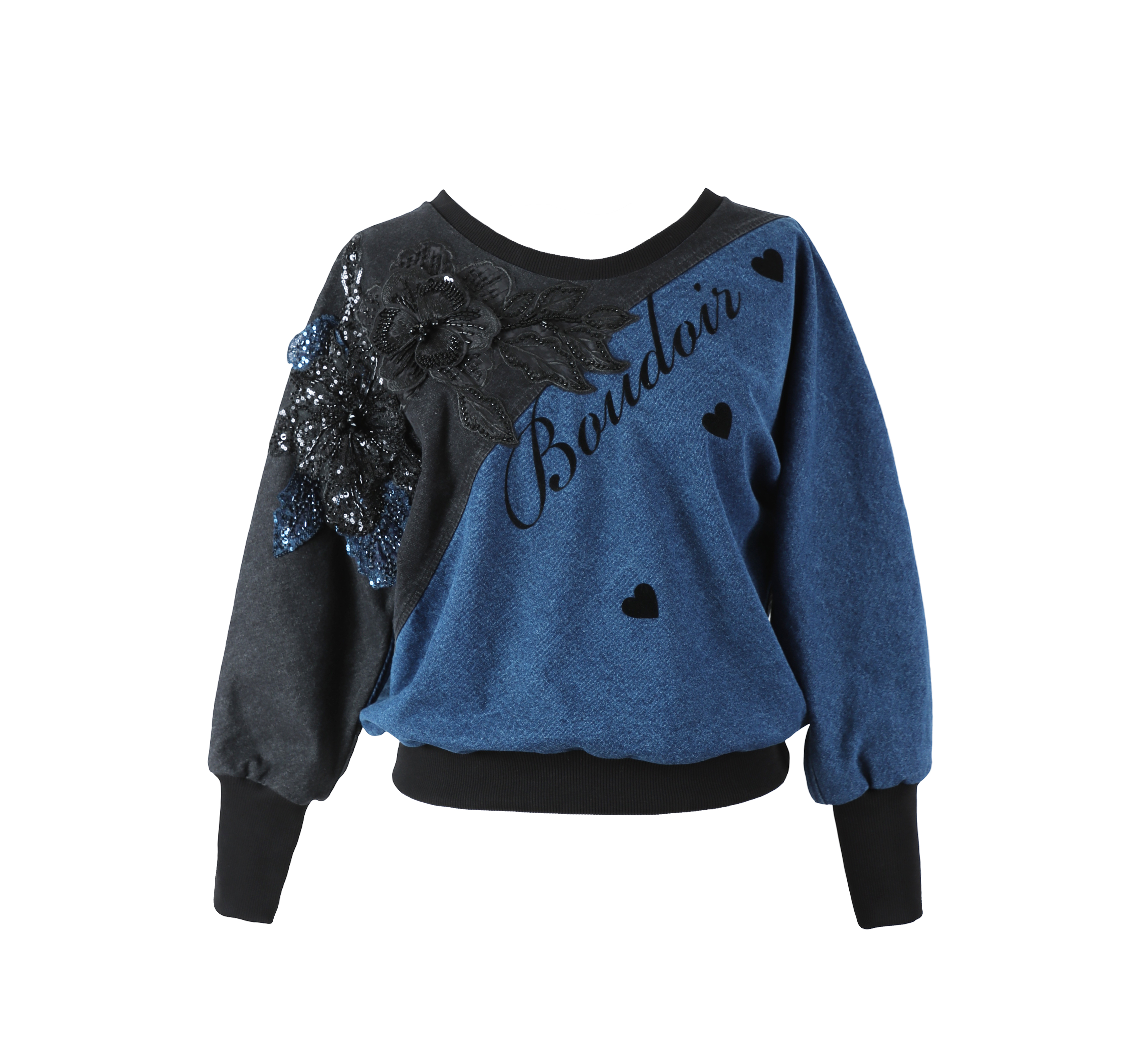 Unikatni Boudoir sweatshirt izrađen od mekanog denima u dvije boje. Posebnost mu daje raskošna cvjetna aplikacija ukrašena šljokicama i čipkom, koja se proteže preko ramena i stvara dramatičan, ali sofisticiran dojam. Na prednjoj strani nalazi se prepoznatljiv Boudoir potpis. Oversized kroj s puf rukavima i udobnim rebrastim renderima čini ga savršenim spojem udobnosti i luksuza. Savršen je za statement casual look ili za kombiniranje s elegantnijim komadima za moderan, ležerno-chic stil.